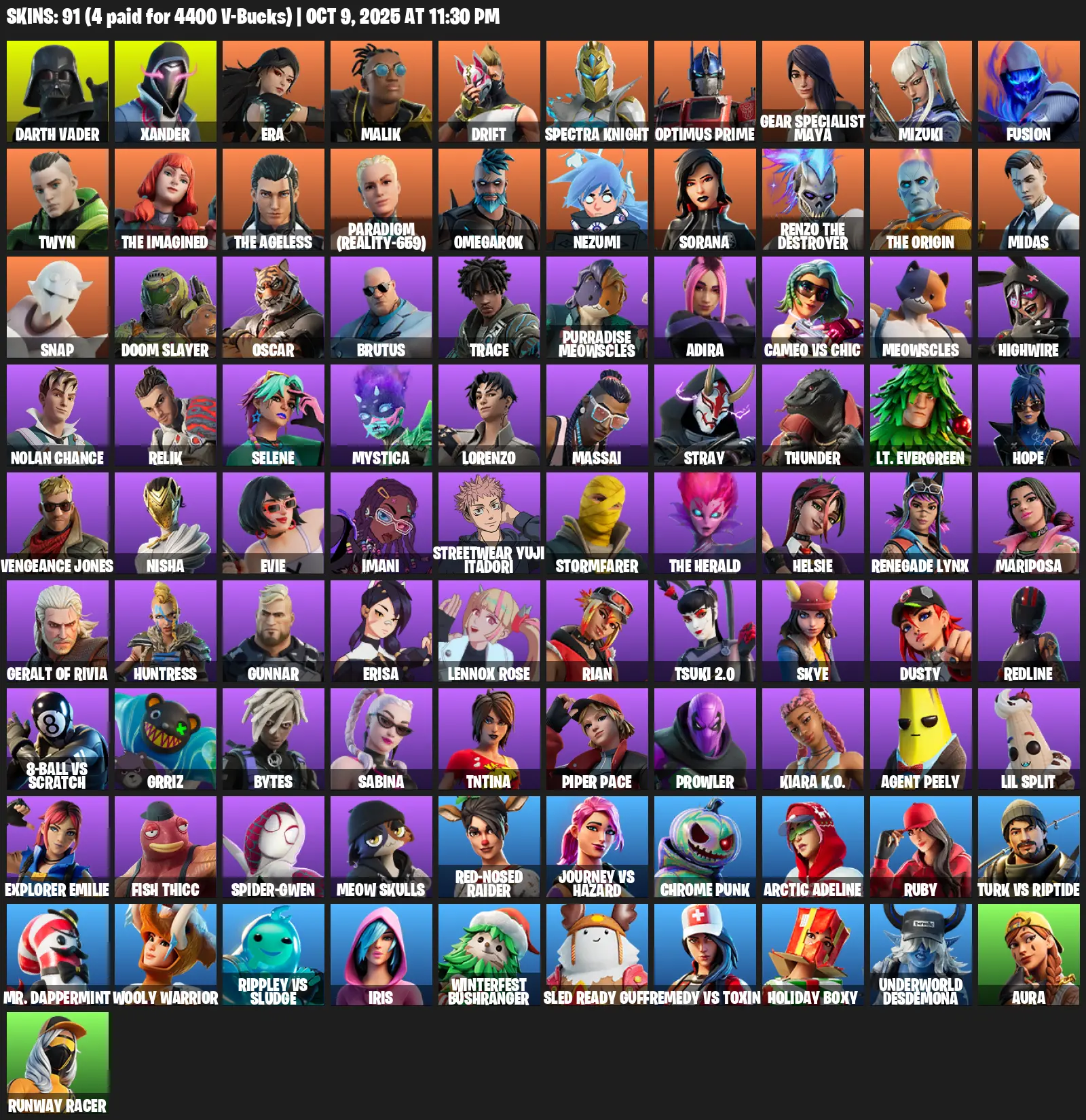 [PC/XBOX] | 91 skins | 600 V-bucks | Merry Mint Axe | Darth Vader | Xander | Era | Malik | Drift | Spectra Knight | Optimus Prime | #UGI8556 | #MBFN