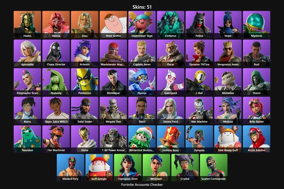 PC/XBOX/PSN 51 Skins⚡ | Hades | Valeria | Zeus | Peter Griffin | Undercover Skye | Cerberus | Felina | Hope | Mysterio | Aphrodite | Chaos Director | Artemis