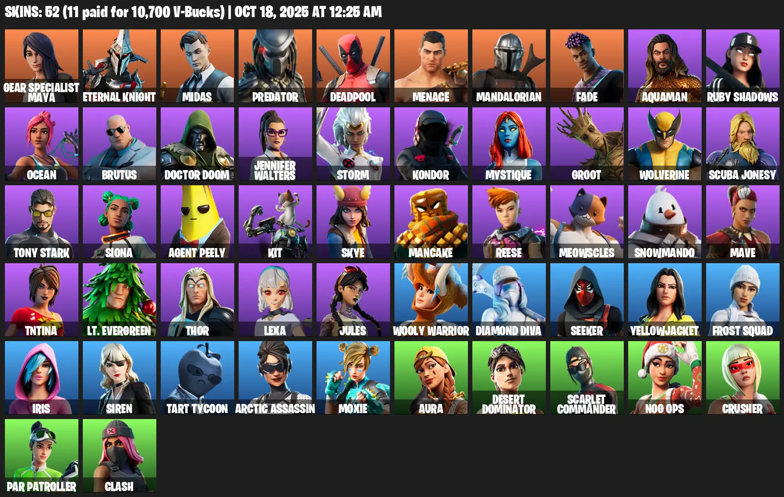 [PC/XBOX/PSN] 52 Skins | Gear Specialist Maya | Eternal Knight | Midas | Predator | Deadpool | Menace | Mandalorian | Fade | Aquaman | Ruby Shadows | Ocean | Brutus | Doctor Doom | Jennifer Walters | Storm | Kondor | Mystique | Groot | Wolverine