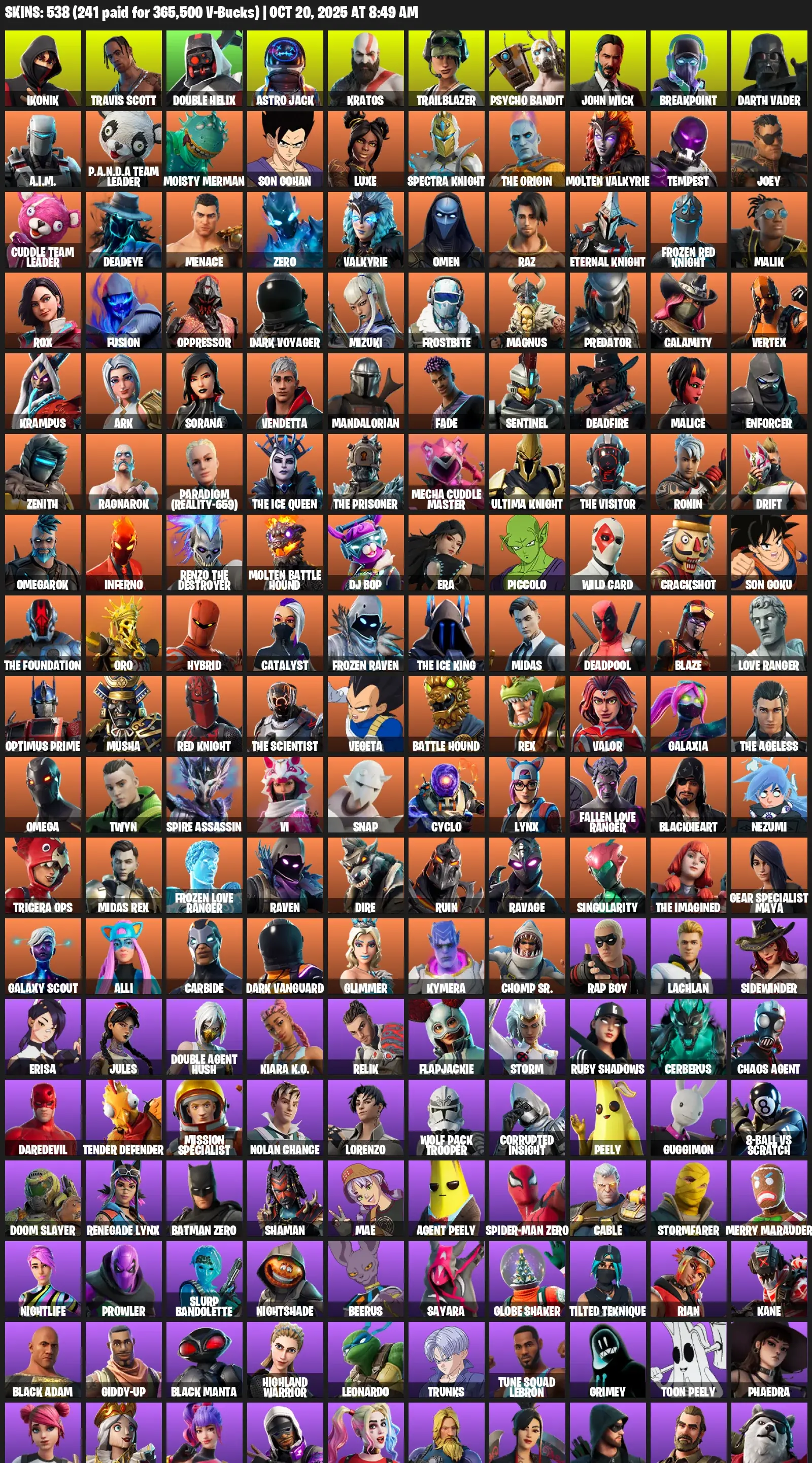 [PC/XBOX/PSN] 538 Skins | IKONIK | Travis Scott | Double Helix | Astro Jack | Kratos | Trailblazer | Psycho Bandit | John Wick | Breakpoint | Darth Vader | A.I.M. | P.A.N.D.A Team Leader | Moisty Merman | Son Gohan | Luxe | Spectra Knight | The Origin