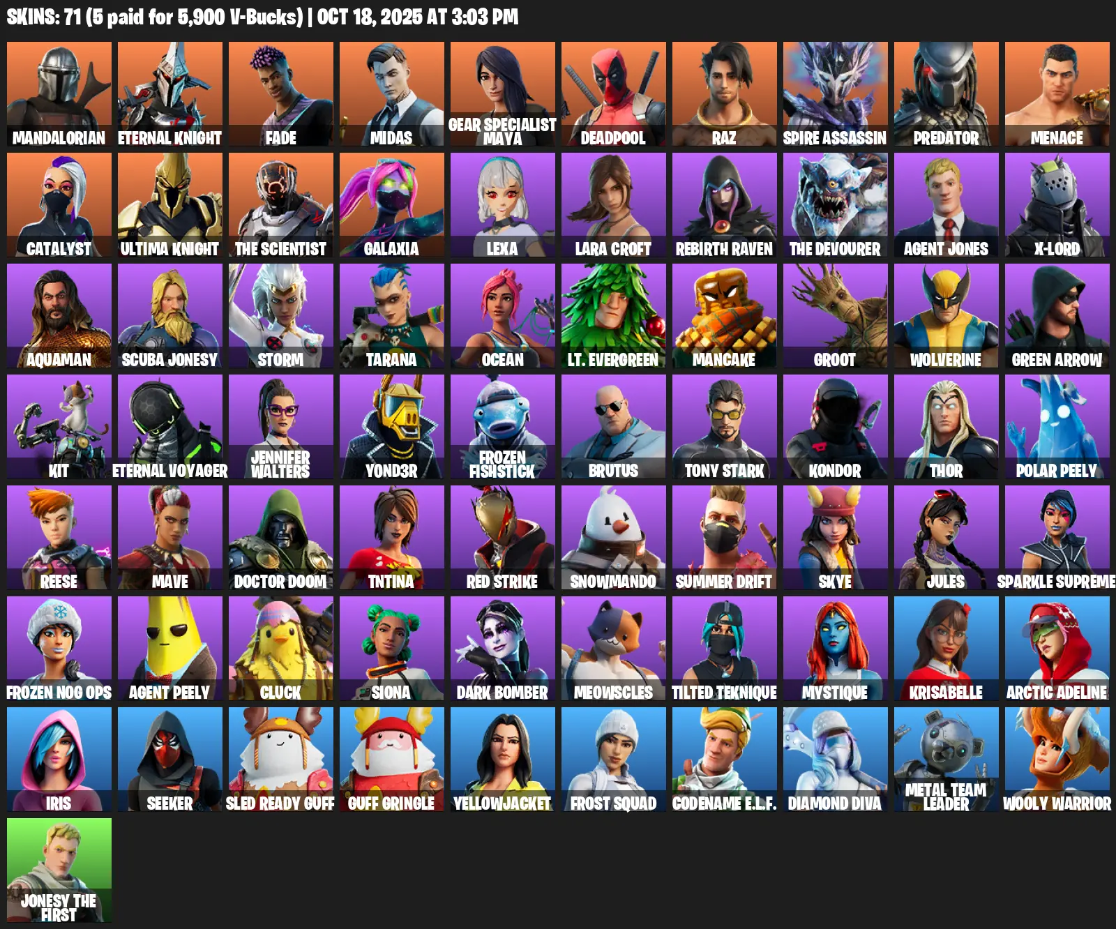 [PSN/XBOX/PC] 71 Skins | Mandalorian | Eternal Knight | Fade | Midas | Gear Specialist Maya | Deadpool | Raz | Spire Assassin | Predator | Menace | Catalyst | Ultima Knight | The Scientist | Galaxia | Lexa | Lara Croft | Rebirth Raven | The Devourer