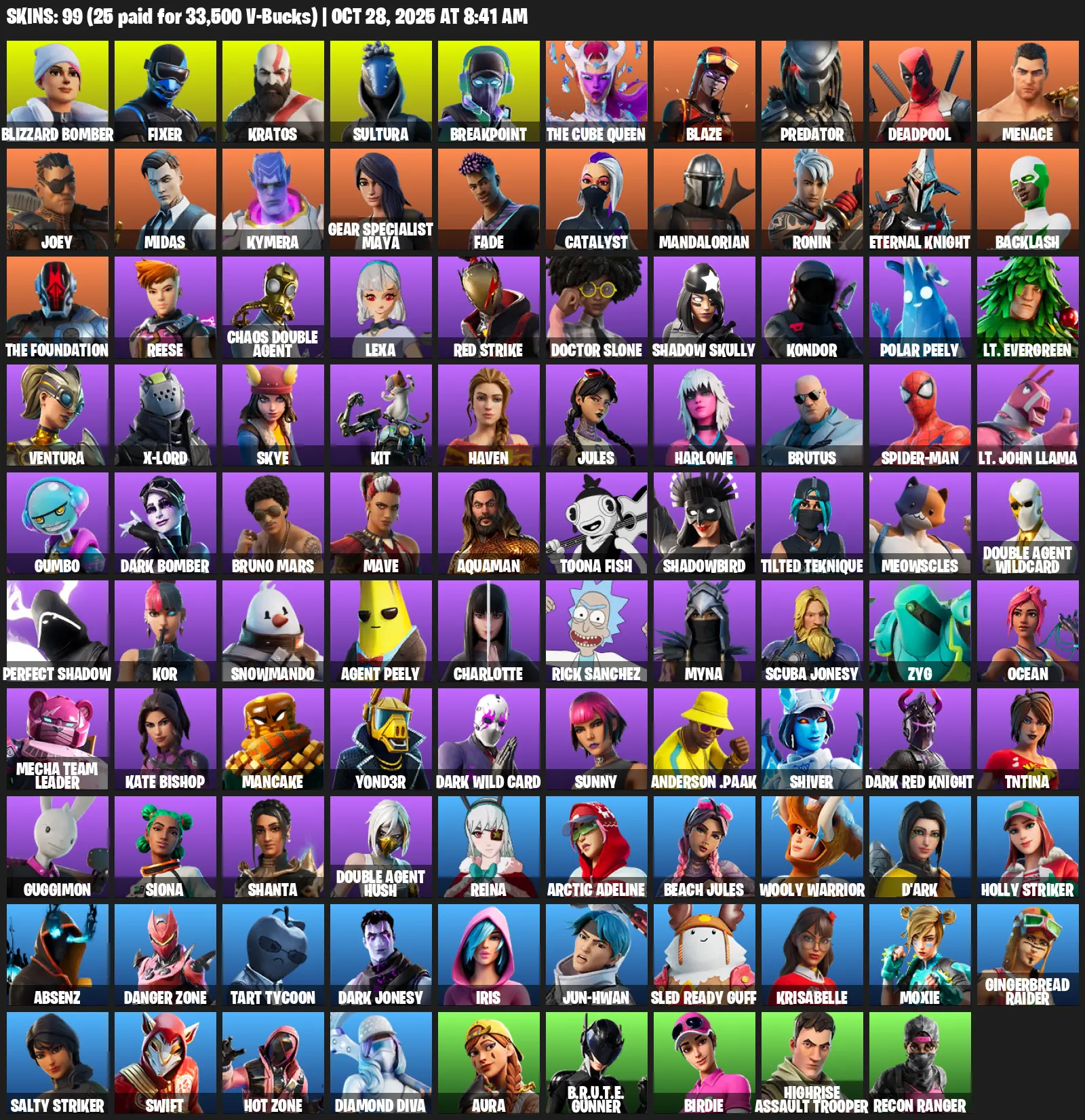 [PSN/XBOX/PC] 99 Skins | Blizzard Bomber | Fixer | Kratos | Sultura | Breakpoint | The Cube Queen | Blaze | Predator | Deadpool | Menace | Joey | Midas | Kymera | Gear Specialist Maya | Fade | Catalyst | Mandalorian | Ronin | Eternal Knight | Backlash