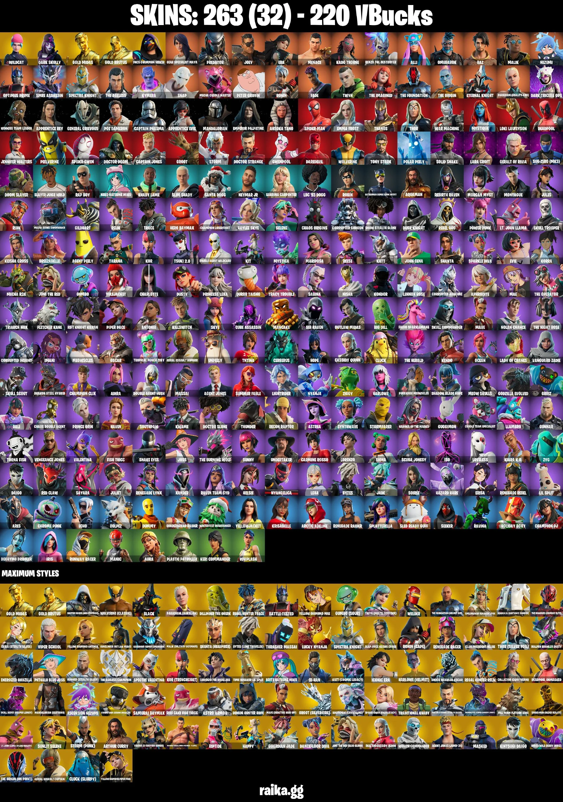 πβ¨STACKED EXCLUSIVE ACCOUNTβ¨π 263 SKINS π WILDCAT π DARK SKULLY π AGENT PEELY π TONY STARK π SKULL TROOPER π REAPER π RENEGADE RAIDER π GOLD MIDAS π GOLD BRUTUS π FNCS CHAMPION SEEKER π GEAR SPECIALIST MAYA π 220 VBUCKS β‘οΈPC/PSN/XBOXβ‘οΈ