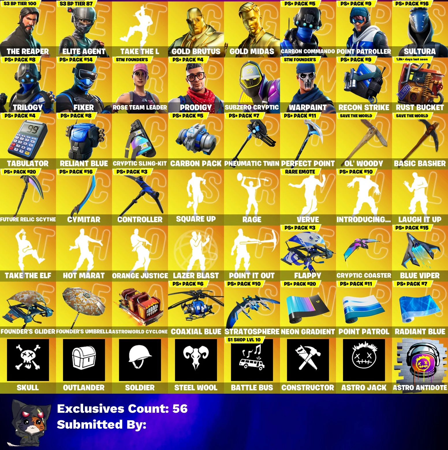 🎒🔥 STACKED OG ACCOUNT 🔥🎒 213 SKINS 💎 THE REAPER 💎 TAKE THE L 💎 ELITE AGENT 💎 GOLD BRUTUS 💎 GOLD MIDAS 💎 CARBON COMMANDO 💎 SULTURA 💎 TRILOGY 💎 FIXER 💎 PRODIGY 💎 SUBZERO CRYPTIC 💎 KYMERA 💎 GEAR SPECIALIST MAYA 💎 SNAP 💎 750 VB 💎 OG STW 💎 FULL ACCESS 💎