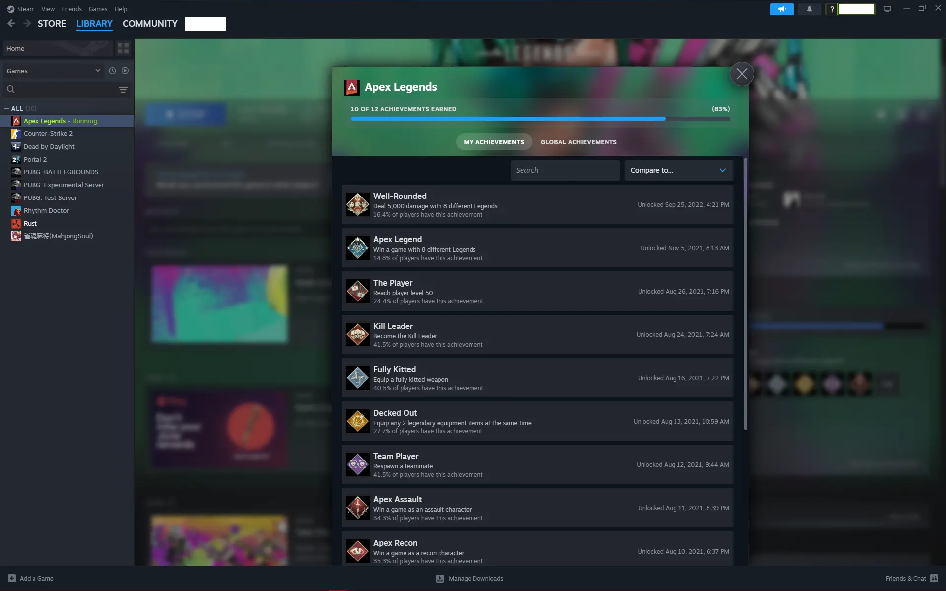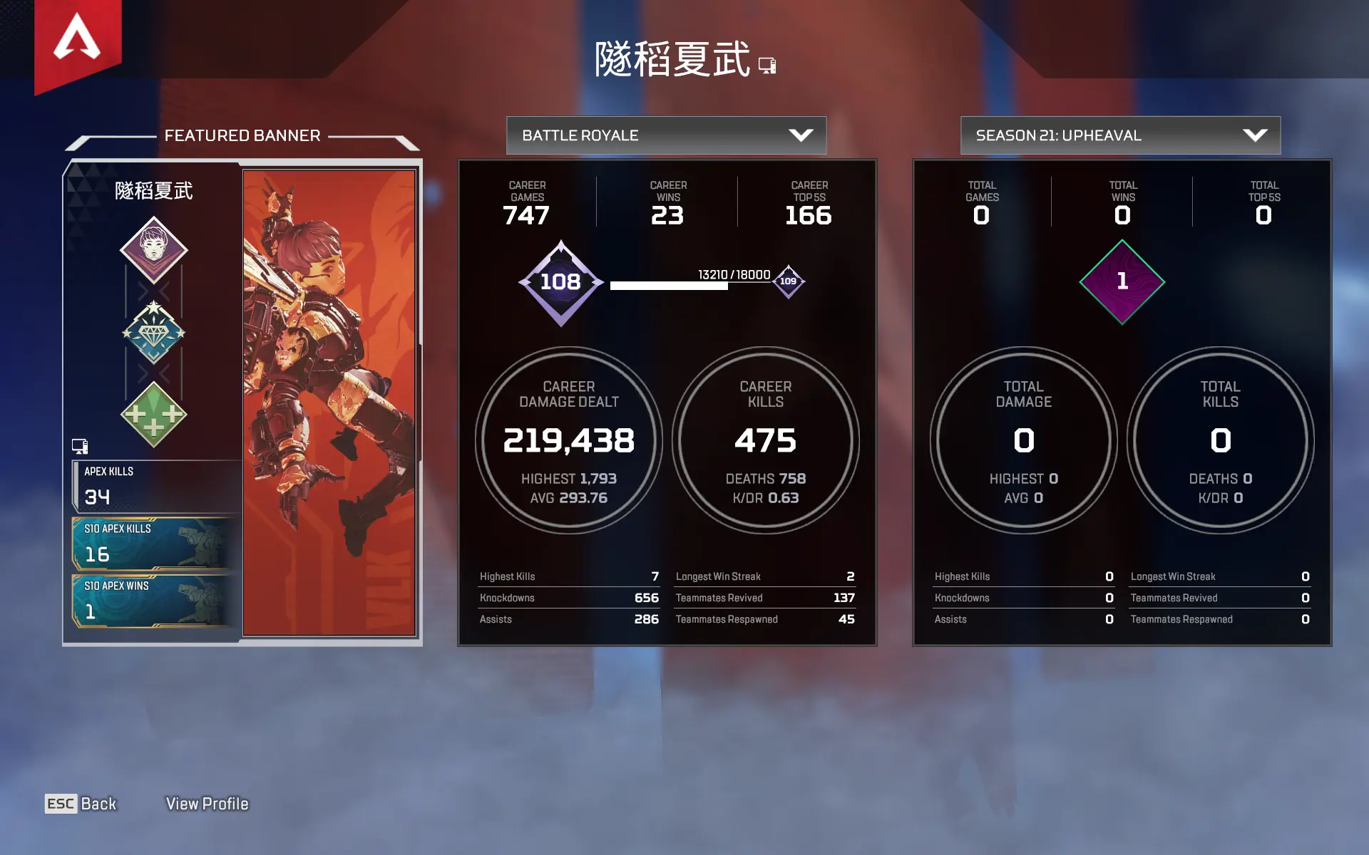 🔴 Level 108 🟢 69 Legends Skins ⚪️ 137 Weapons skins 🟠 13 Legends 🟡 172 RealHours ☑️ Full Access