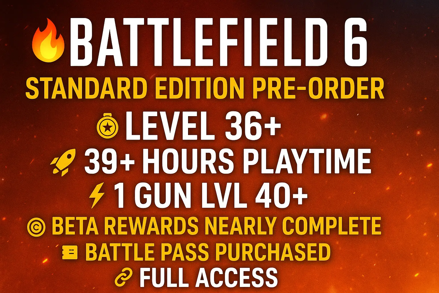 ๐ฅ Battlefield 6 ๐ Standard Edition Pre-Order ๐ ๐ฅ Level 36+ ๐ 39+ Hours Playtime โก 1 Gun Level 40+ ๐ฏ Beta Rewards Nearly Complete ๐ซ Battle Pass Purchased ๐ Full Access