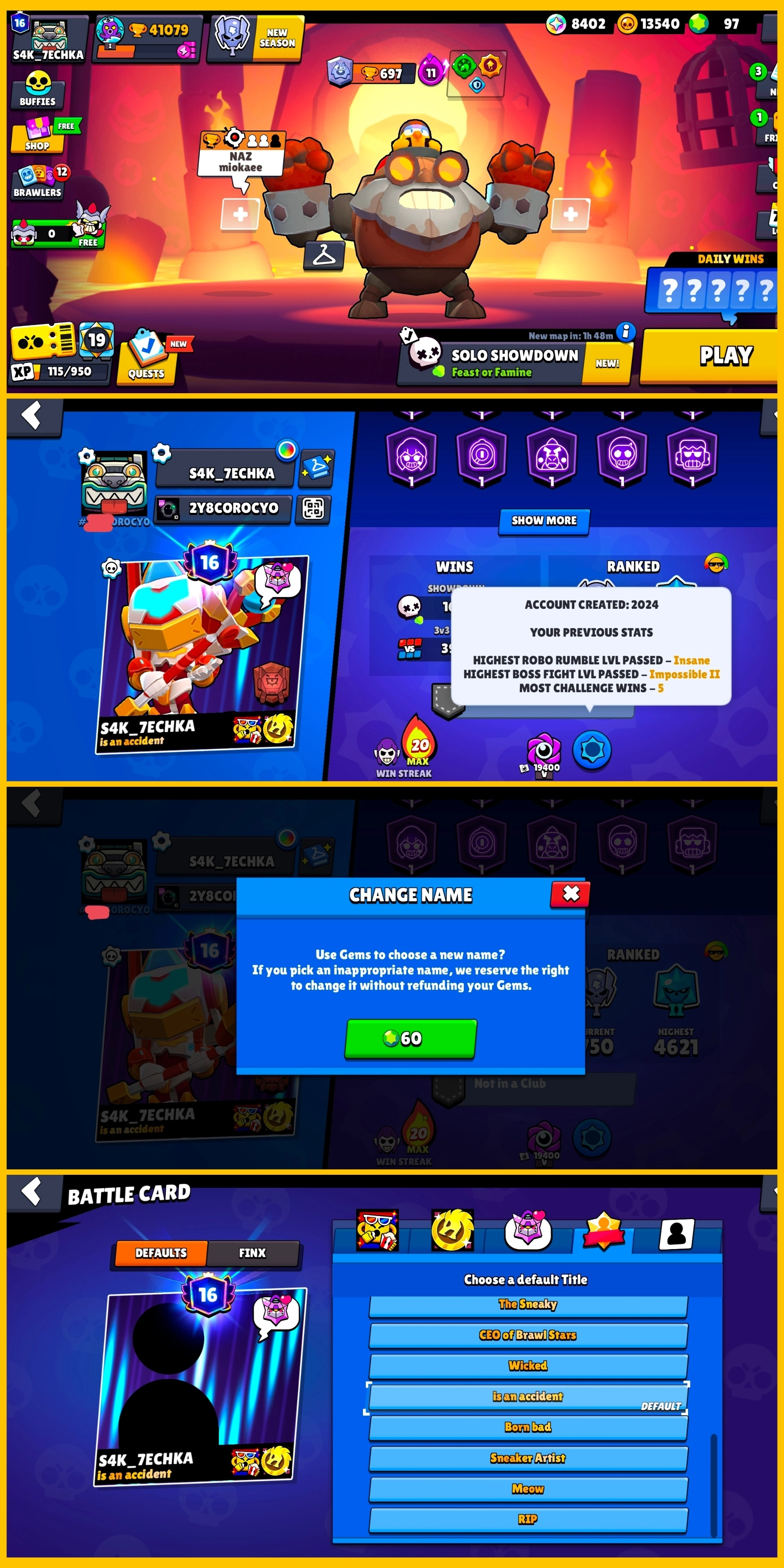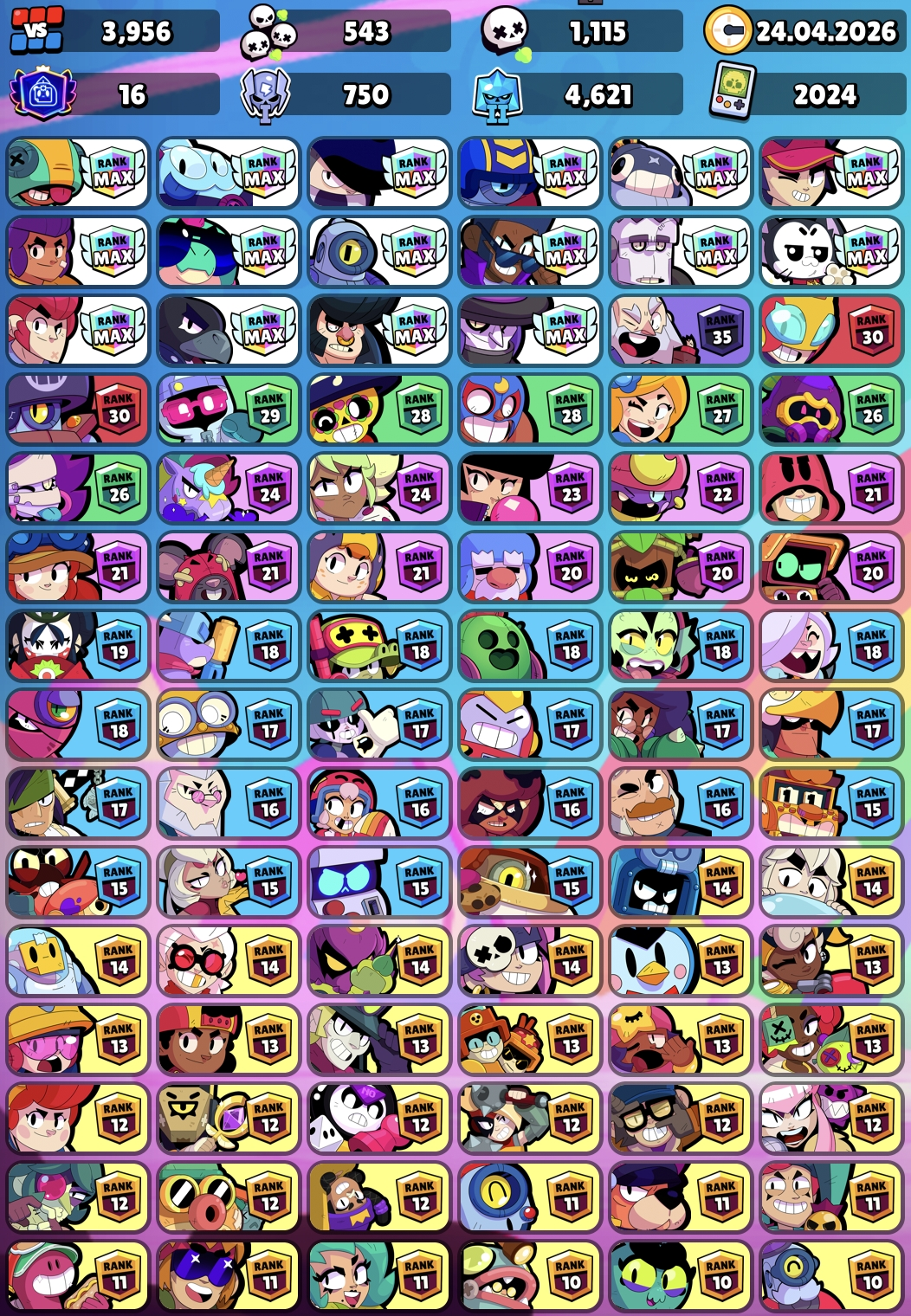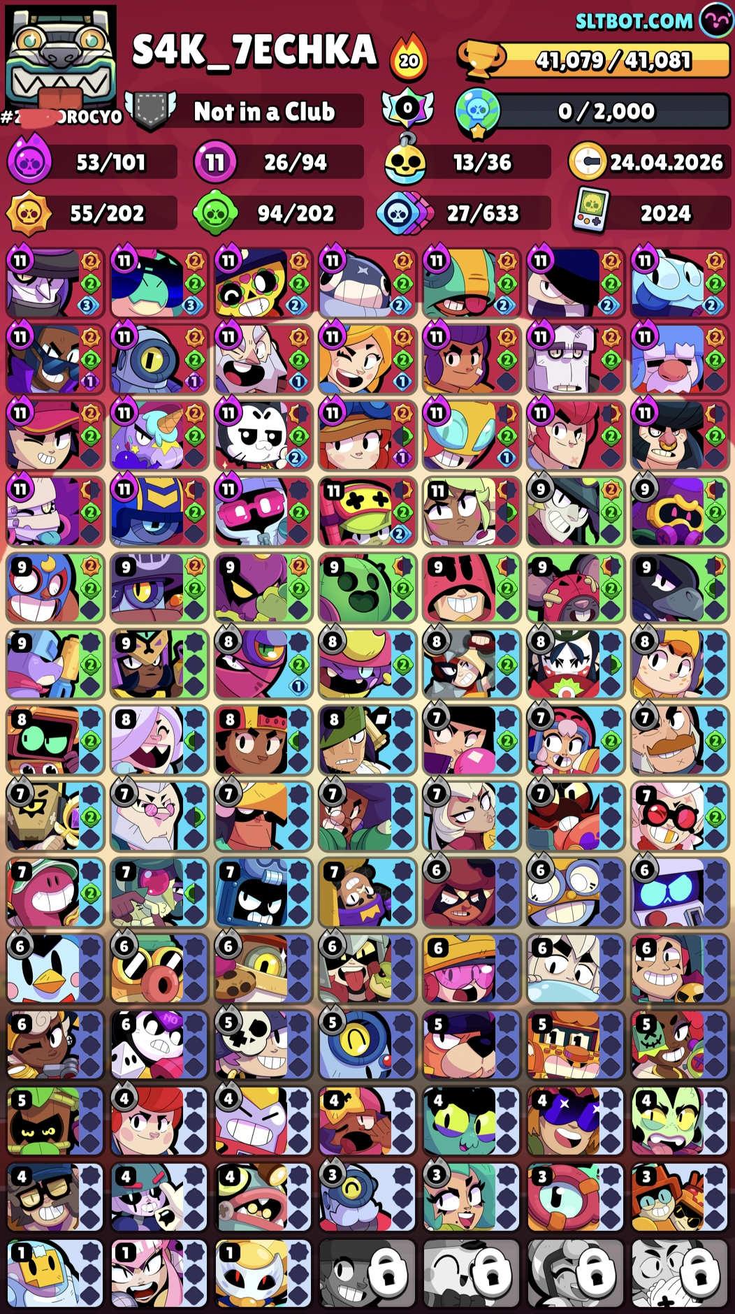 41k TROPHY, 94 BRAWLERS [26 Maxed + 53 Hypercharged UNLOCK] 252 Skins, 16 Prestige, 13 Bluffies | Made in 2024 Year, 5K Matches Played | VR412