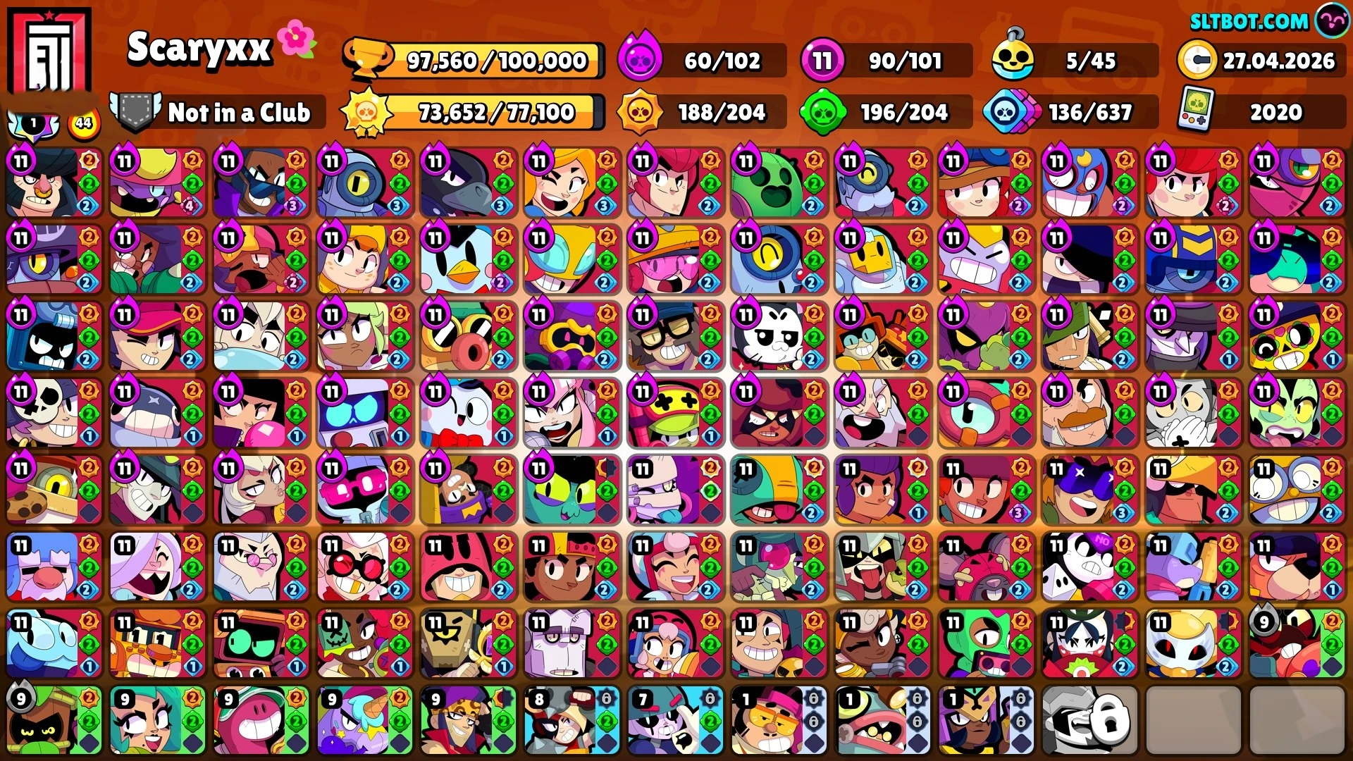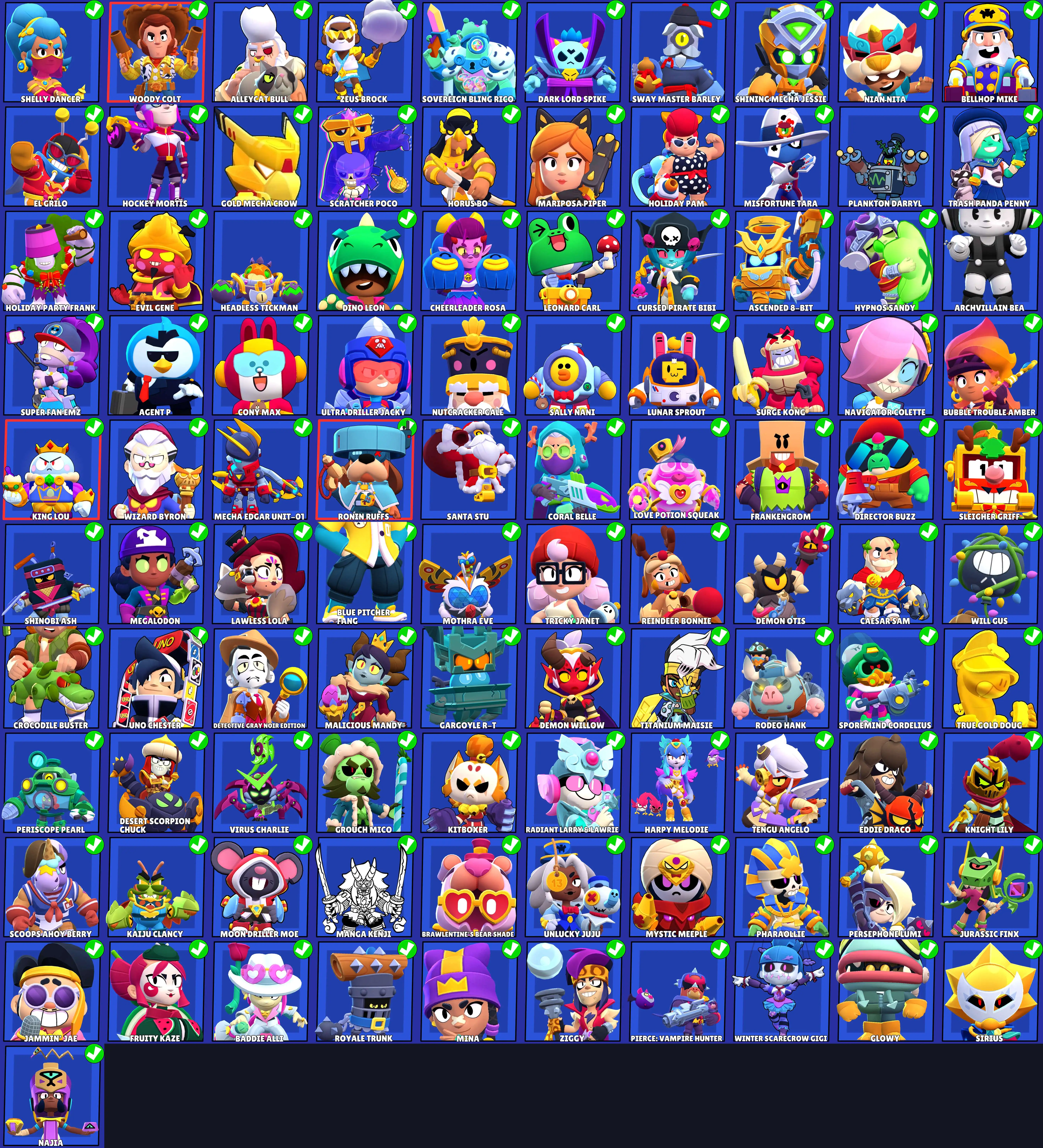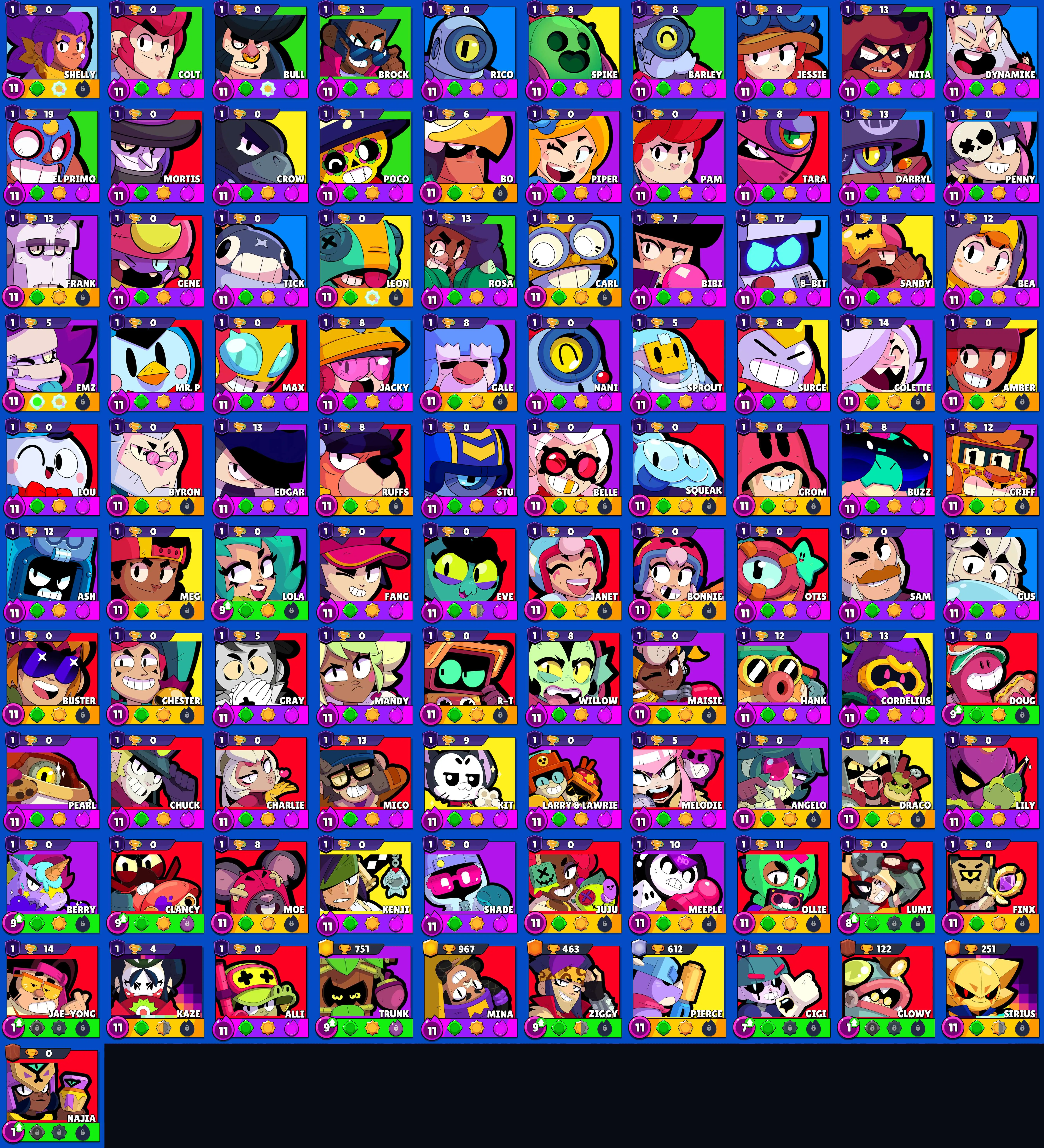 426 SKINS 💯 PRO RANK 💚 R35 PIN 💚 8 35 💚 97.560 TROPHIES 🏆 101 BRAWLERS 🐼 58 HYPERCHARGED 🩸 94 PRESTIGE 💜 87 MAX BRAWLERS 💛 5 BUFFIES 🔑 WOODY COLT 🧡 RONIN RUFFS 🧡 HOCKEY MORTIS 🧡 HOT ROD BROCK 🧡 KING LOU 💯 90K 100K