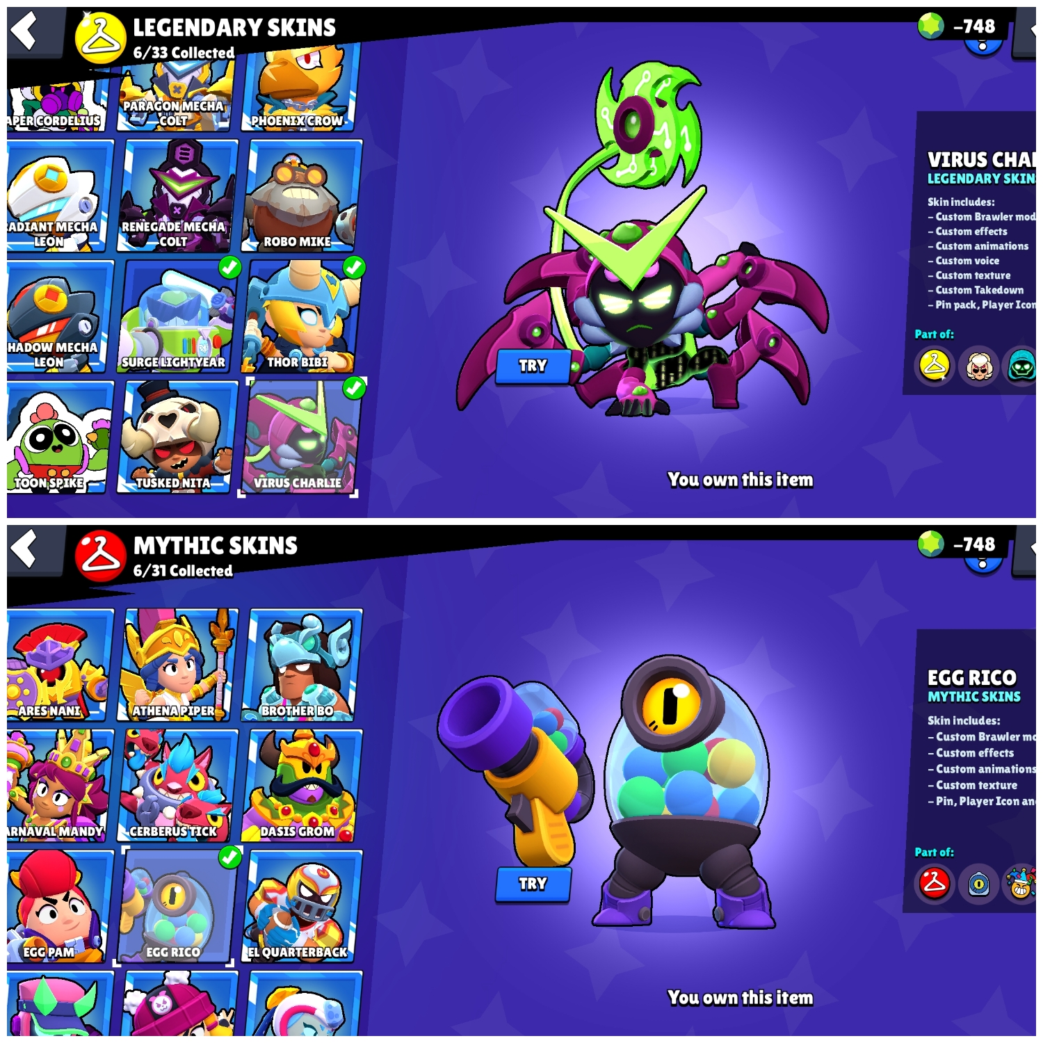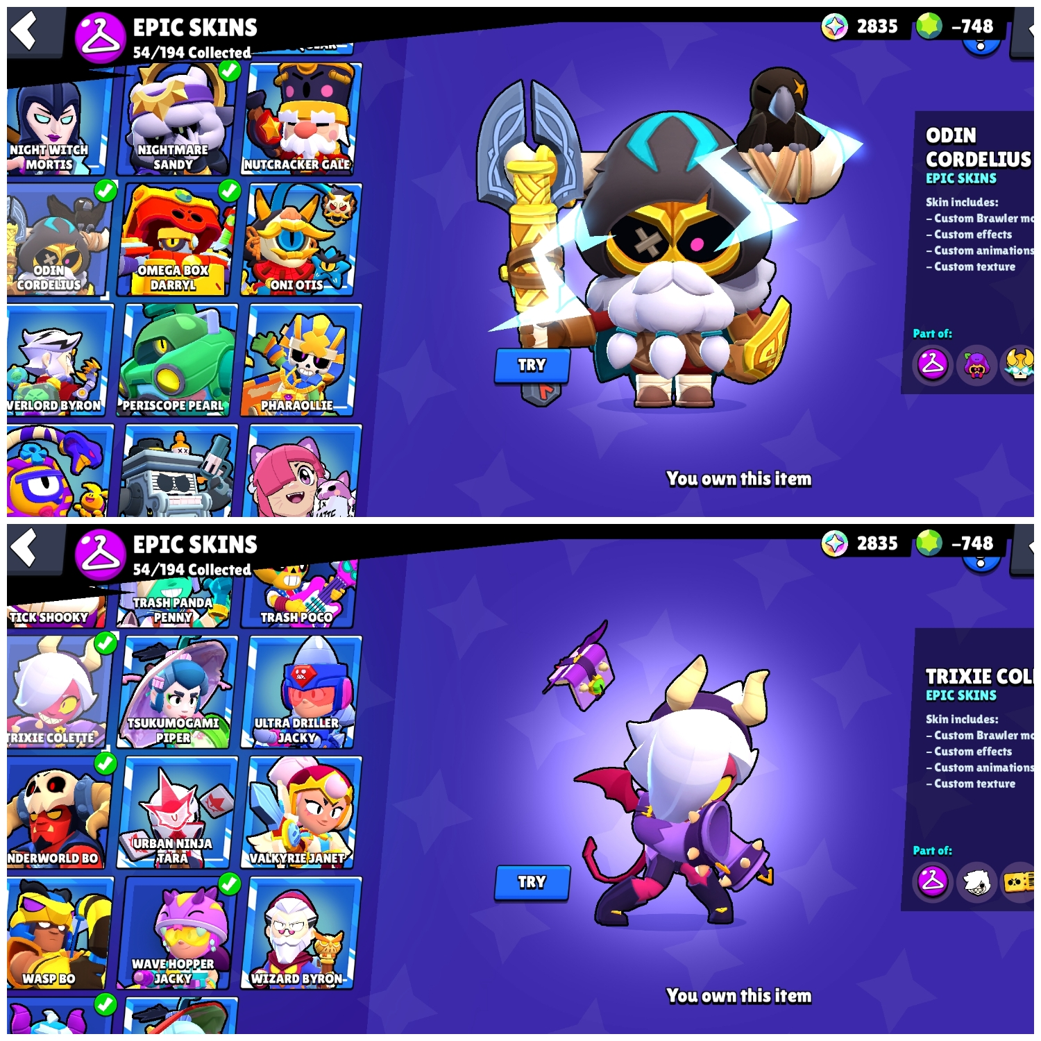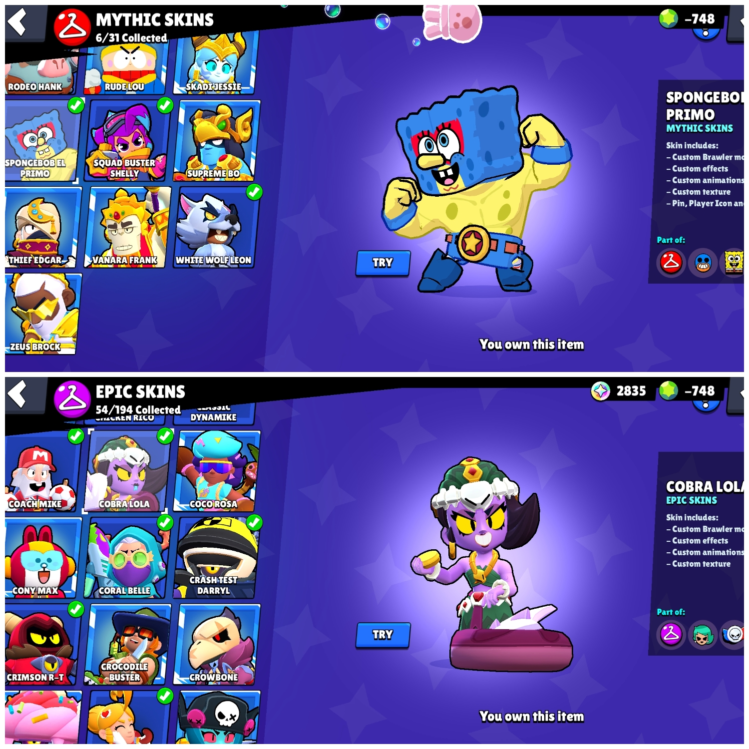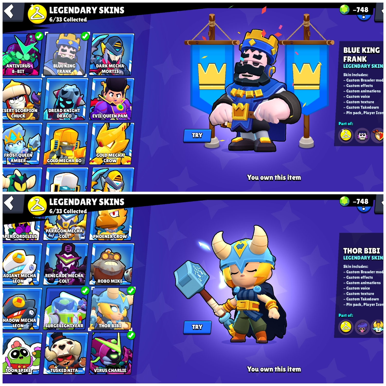 👑 Blue King Frank 🎭 Trixie Colette 🐺 White Wolf Leon 💪 59 Maxed 🌀 27 Hypercharges 🎨 180 OG Skins 🏆 69K Cups 🌌 Saturnian Fame 1 💎 -748 Gems (Negative)