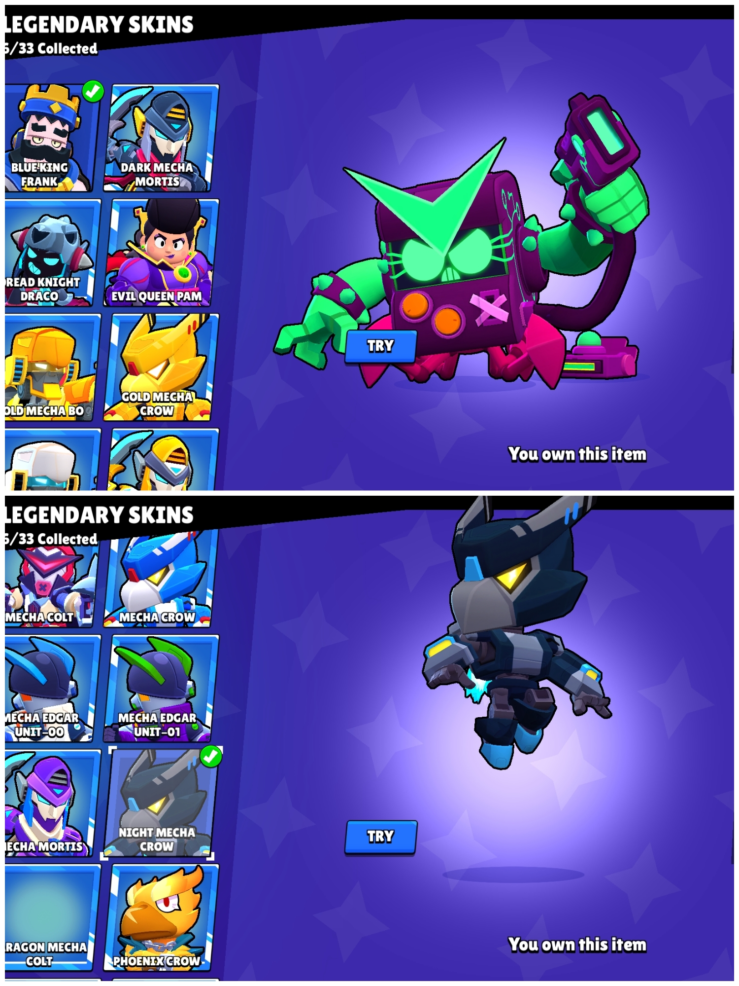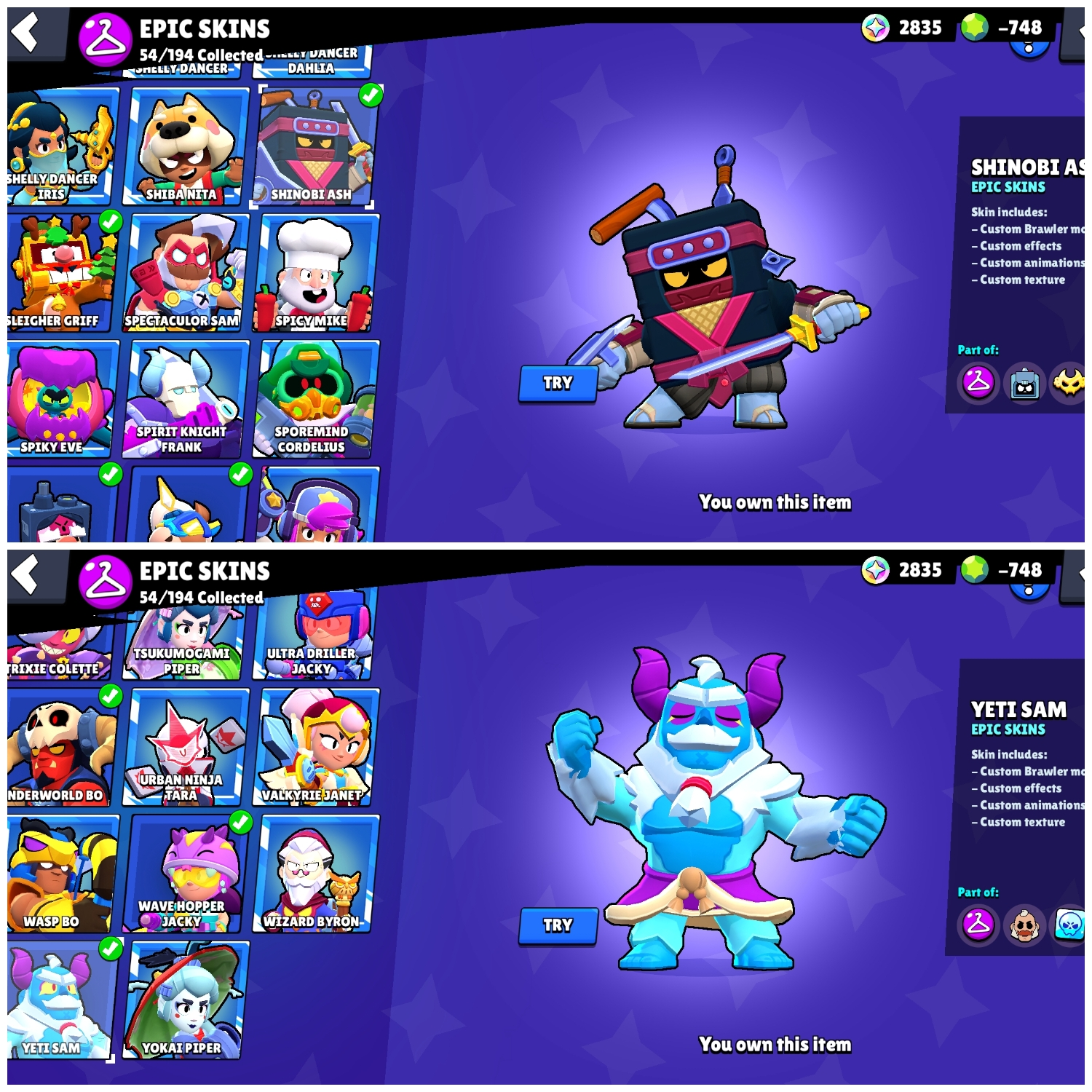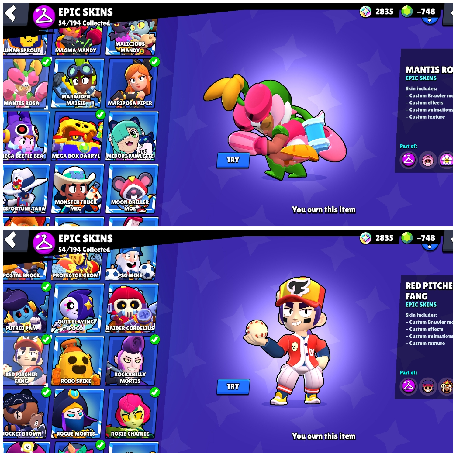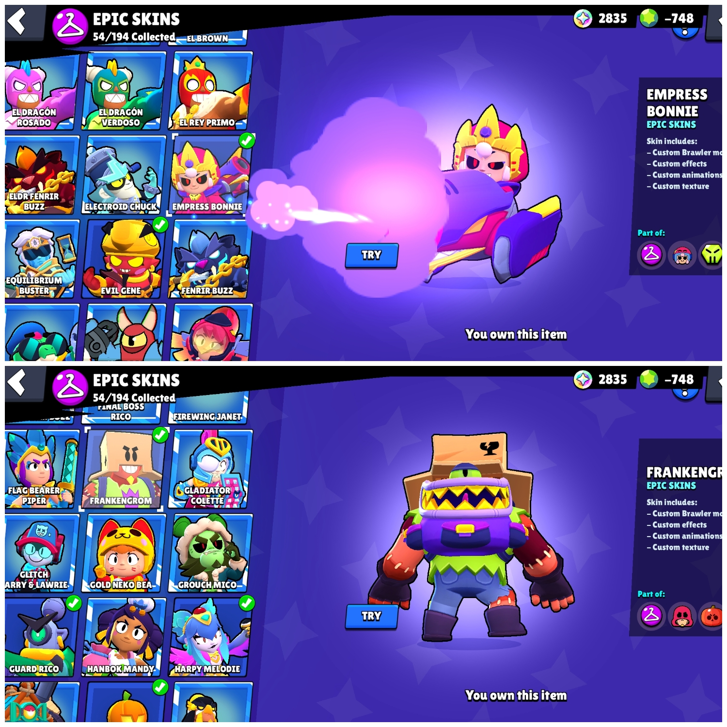 👑 Blue King Frank 🎭 Trixie Colette 🐺 White Wolf Leon 💪 59 Maxed 🌀 27 Hypercharges 🎨 180 OG Skins 🏆 69K Cups 🌌 Saturnian Fame 1 💎 -748 Gems (Negative)