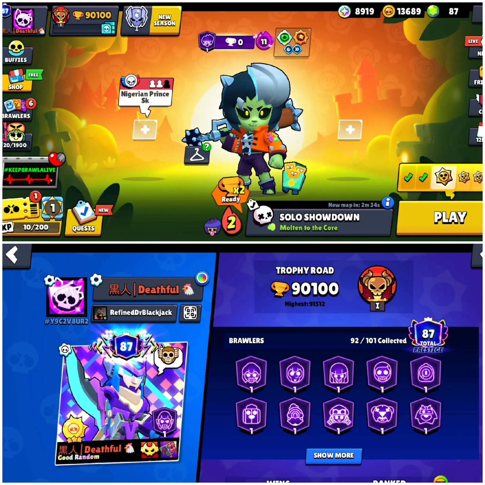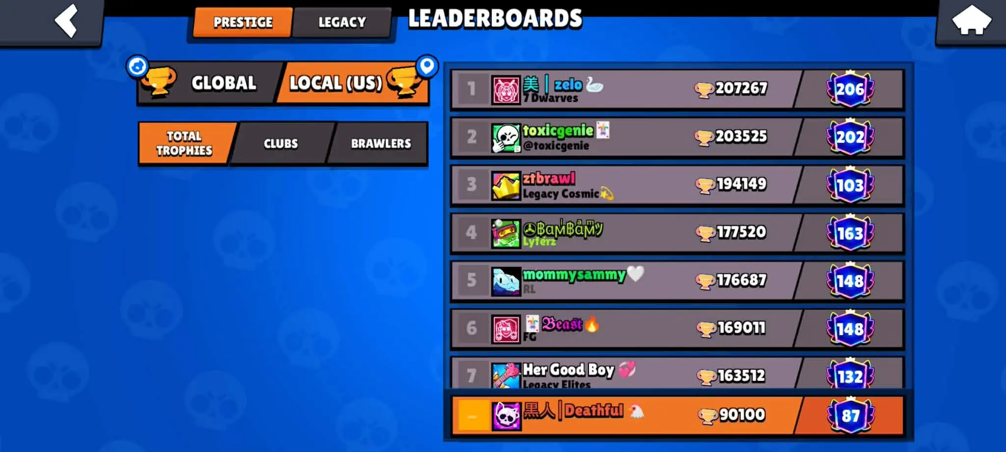 USA LOCAL || 90000 TROPHY || 85 BRAWLER LEVEL 11 MAX || 63 HYPER CHARGE || 87 PRESTIGE || RARE 320 SKIN || 93 UNLOCK