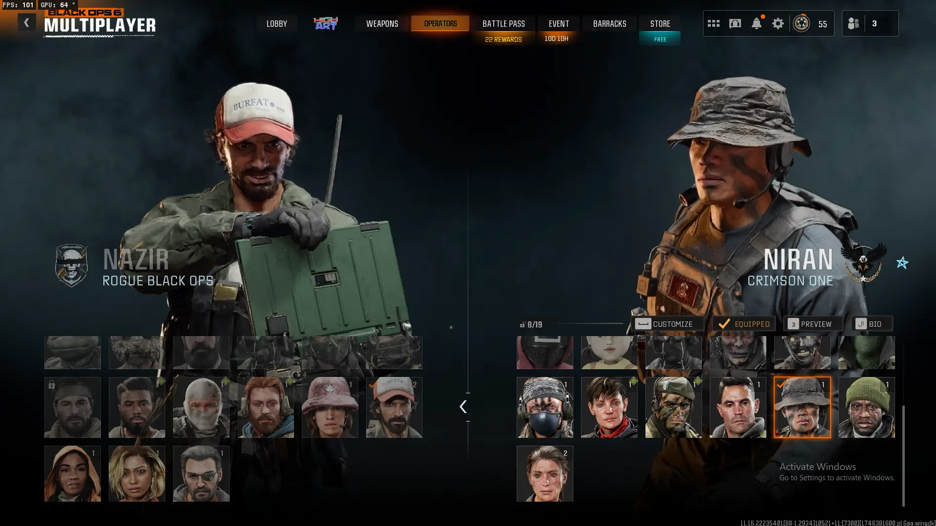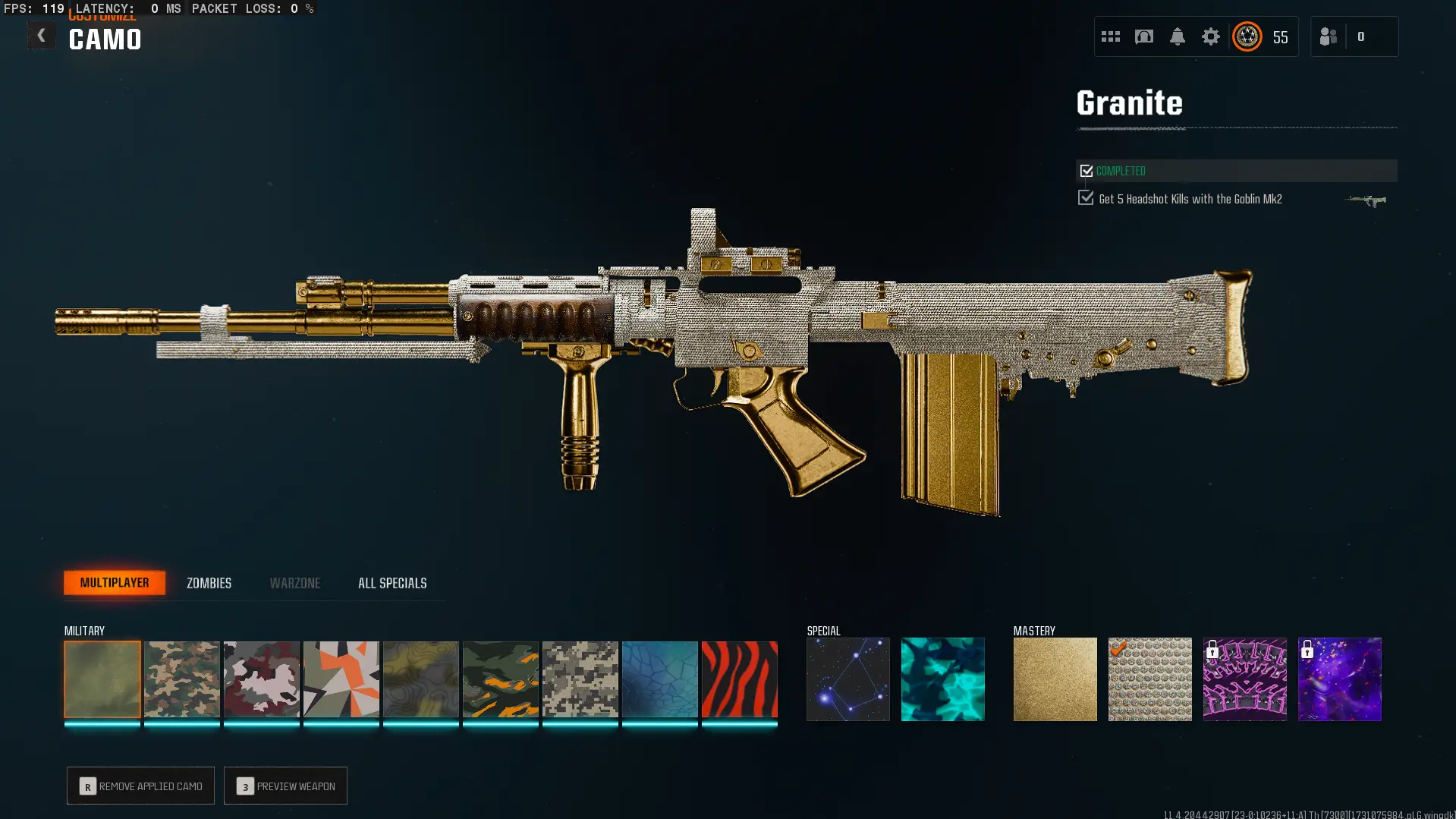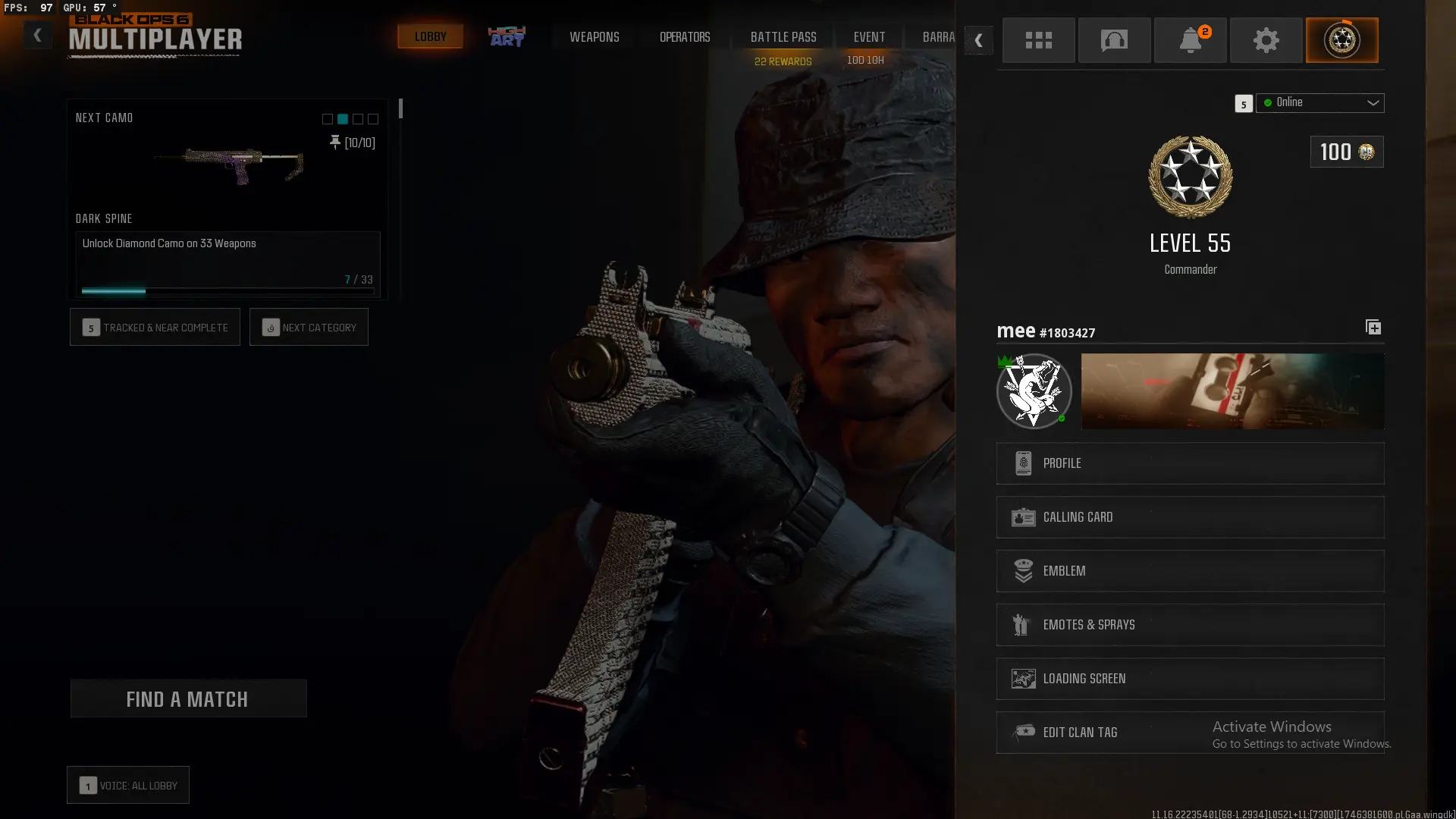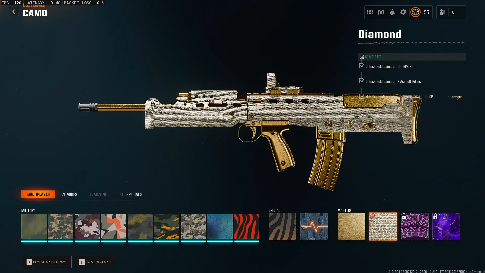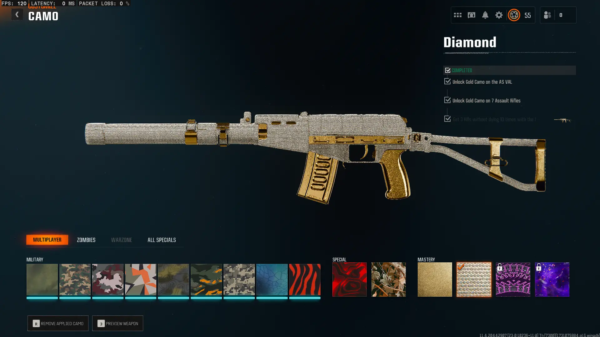BO6 & WZ4 🎮 7 Diamond Camos 💠 91 Camos Unlocked 🔐 Level 55 ⭐ 7 Gold Camos 🏆 17 Operators 👤 Linkable: Steam 💻 Battle.net 🌍 PSN 🎮 Xbox 🎮 #m9s2lkq7