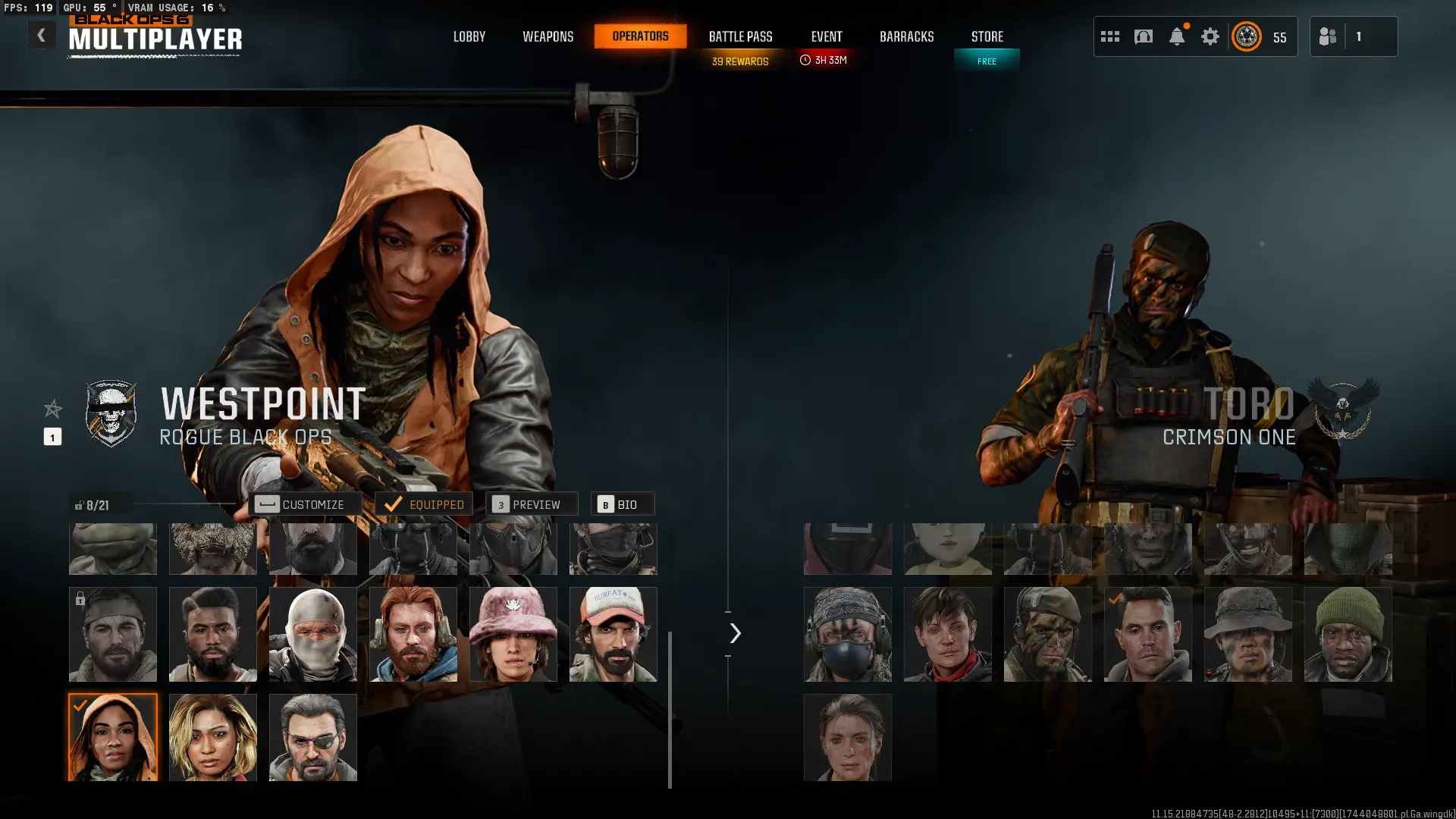 BO6 & WZ4 🎮 7 Diamond Camos 💎 91 Camos Unlocked 🔓 Level 55 🎖️ 7 Gold Camos 🥇 17 Operators 👥 🔗 Linkable to: Steam 💻 Battle.net 🌐 PSN 🎮 Xbox 🕹️