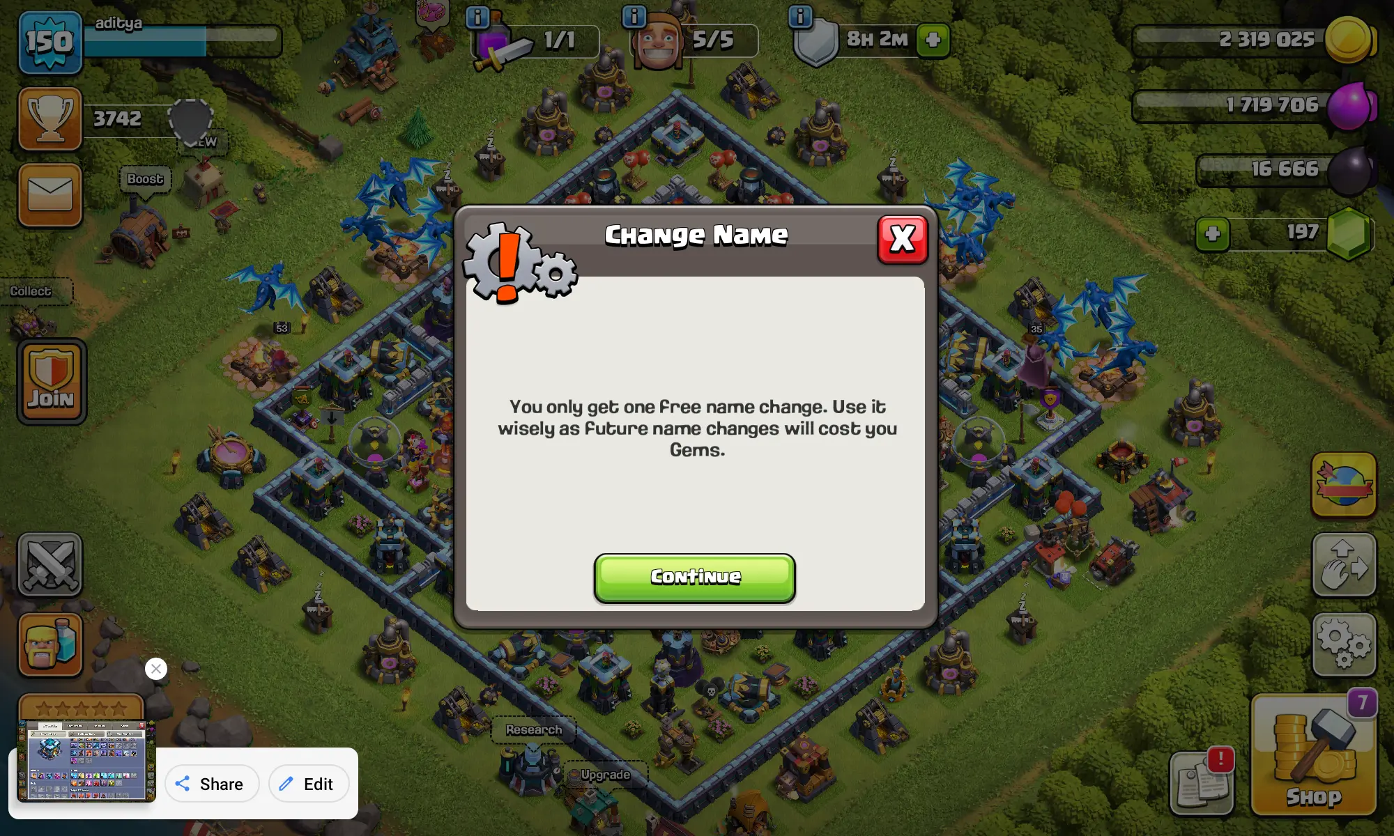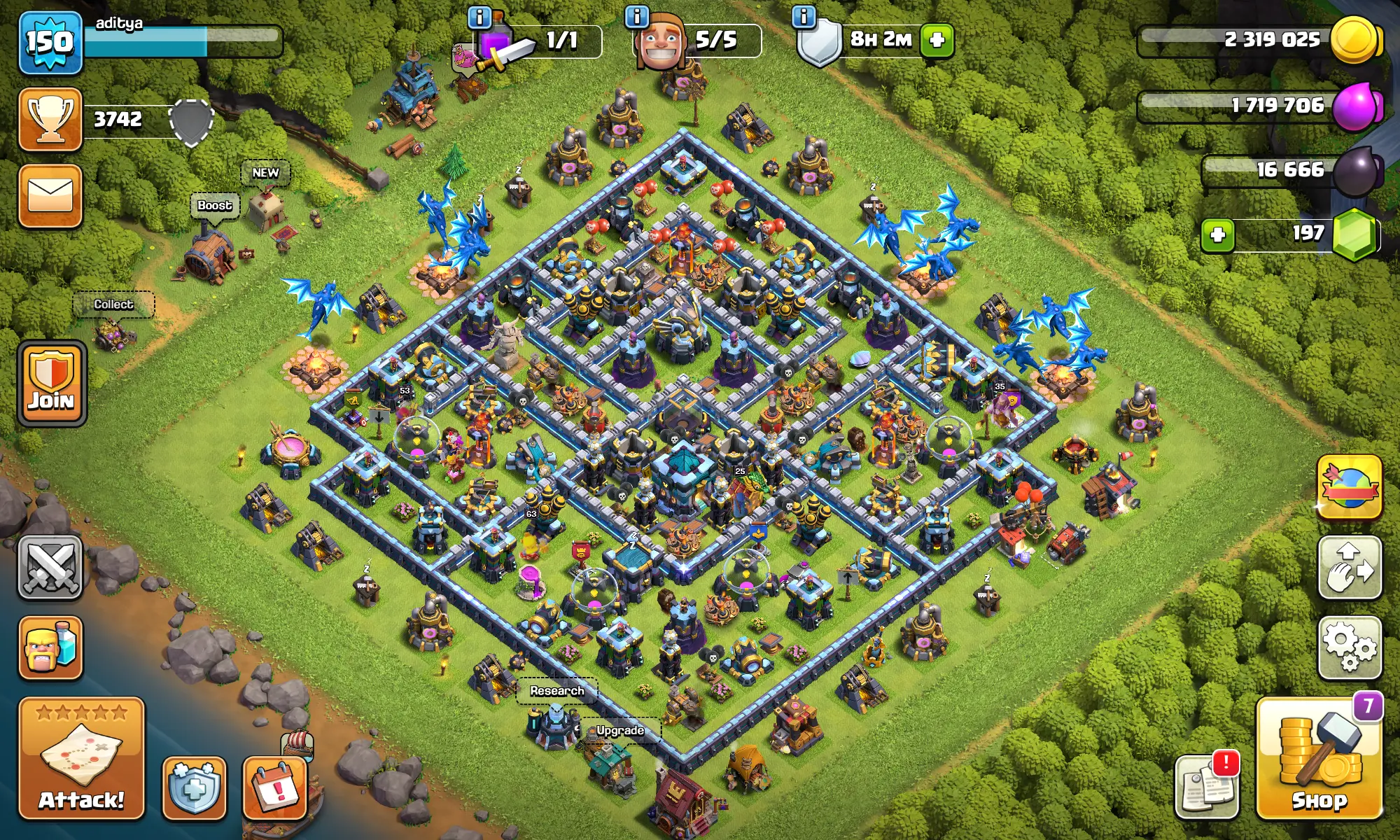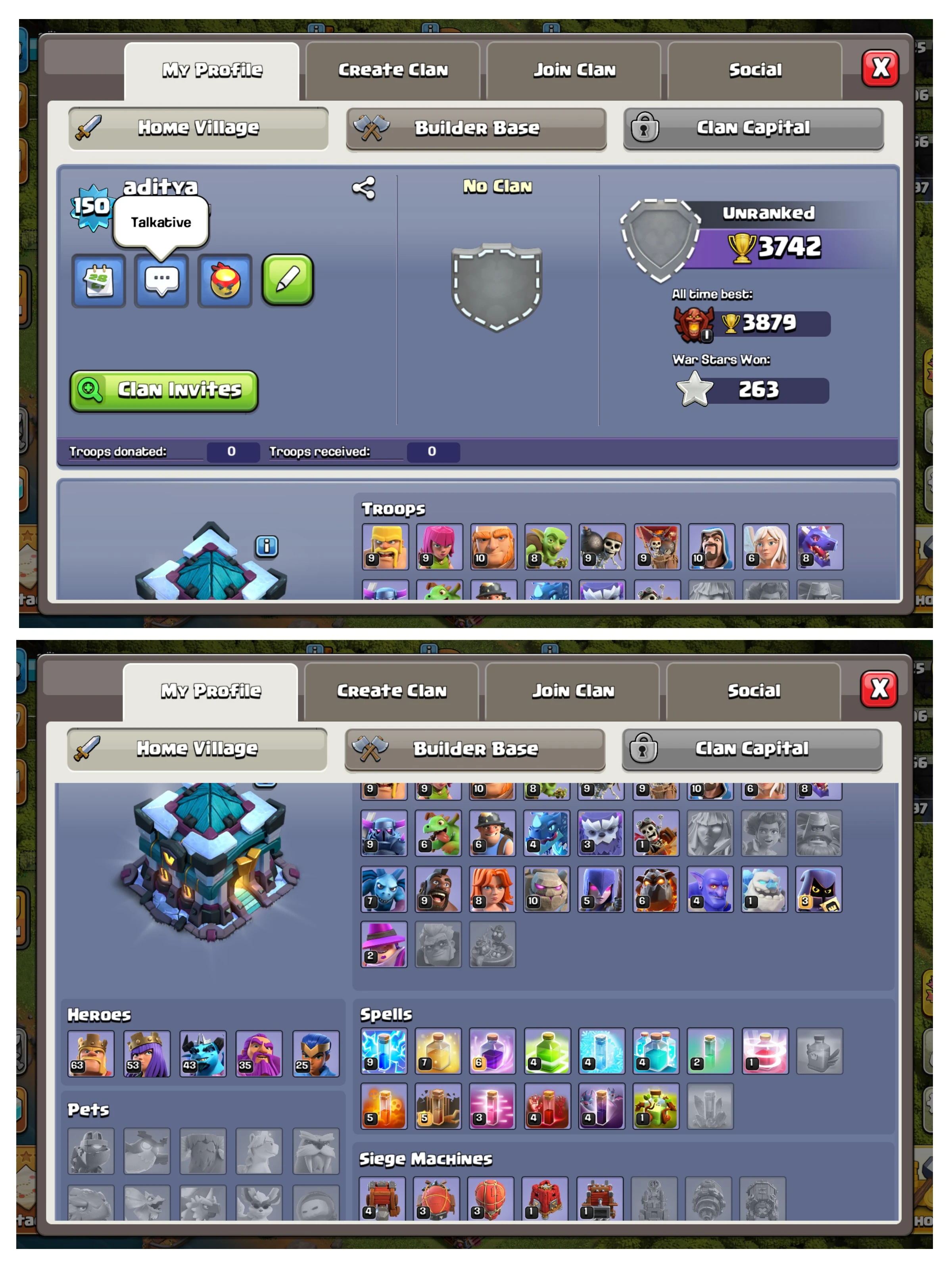 ๐ฆ Dark Blue Wall ๐ | ๐ฐ TH13๐ฅ | ๐ฎ Lvl 150 | ๐ 197 Gems | ๐ Heroes: BKโ๏ธ63 | AQ๐น53 | MP๐น43 | GW๐35 | RC๐ก๏ธ25 | ๐ 3869 Highest Trophies | โญ 263 War Stars | ๐๏ธ CWL 10 | โจ Raid 200 | ๐๏ธ Magic Items ๐ + Epic Equip ๐ซ | ๐ Name Change Available