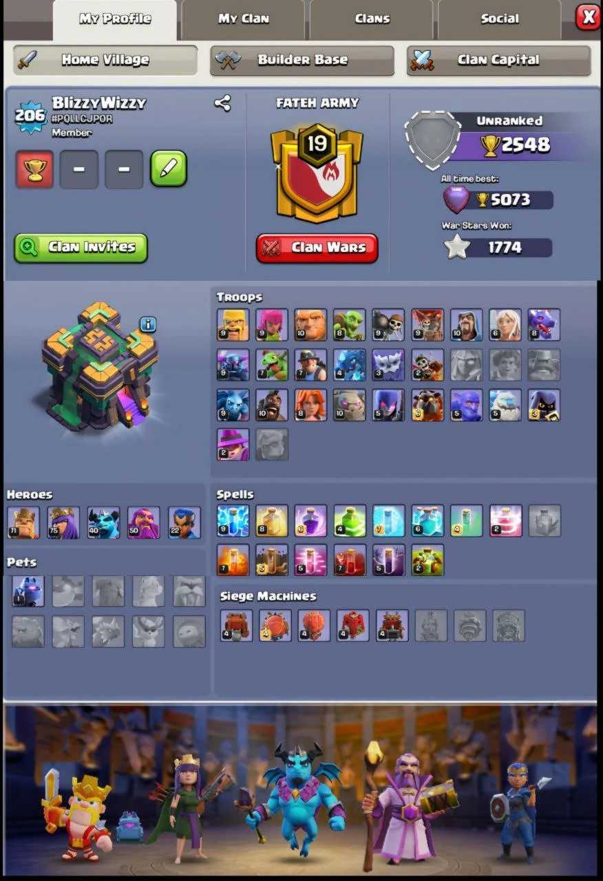 PREMIUM MAXX TH 14 ⚡HEROS [71-75-40-50-22] 👑 1700+ WAR STAR ✨ 200 CWL MEDALS 🖇️ STACKED ⚡ONE EPIC EQUIPMENTS 🎚️ 12 RARE HERO SKINS AVAILABLE ☠️ INSTANT AND 100% ACCES TO ACCOUNT 💥