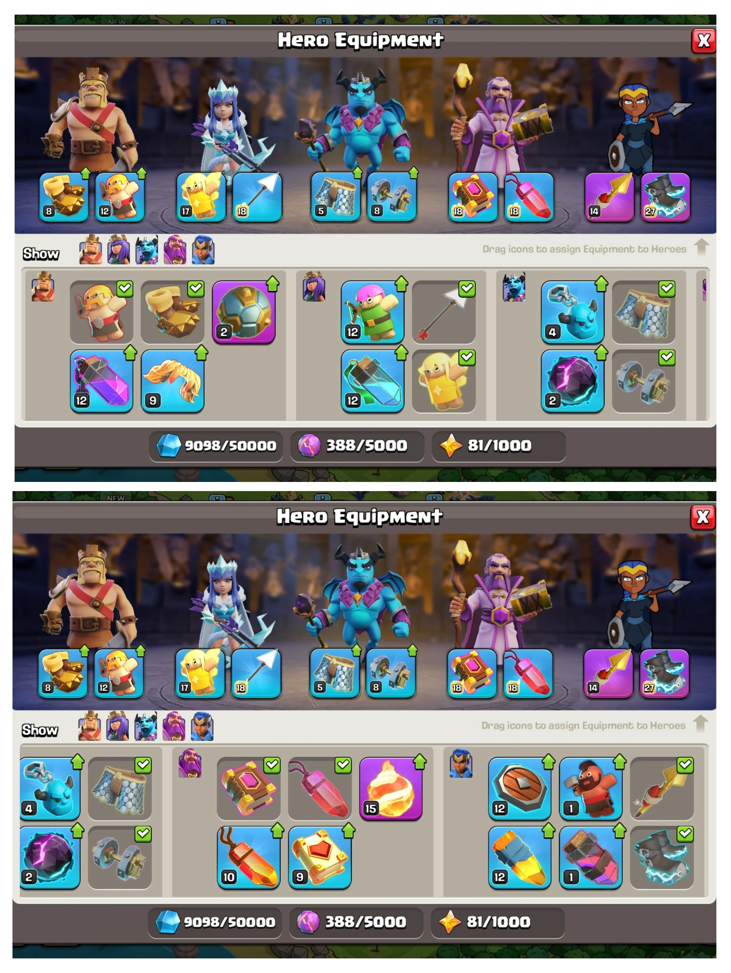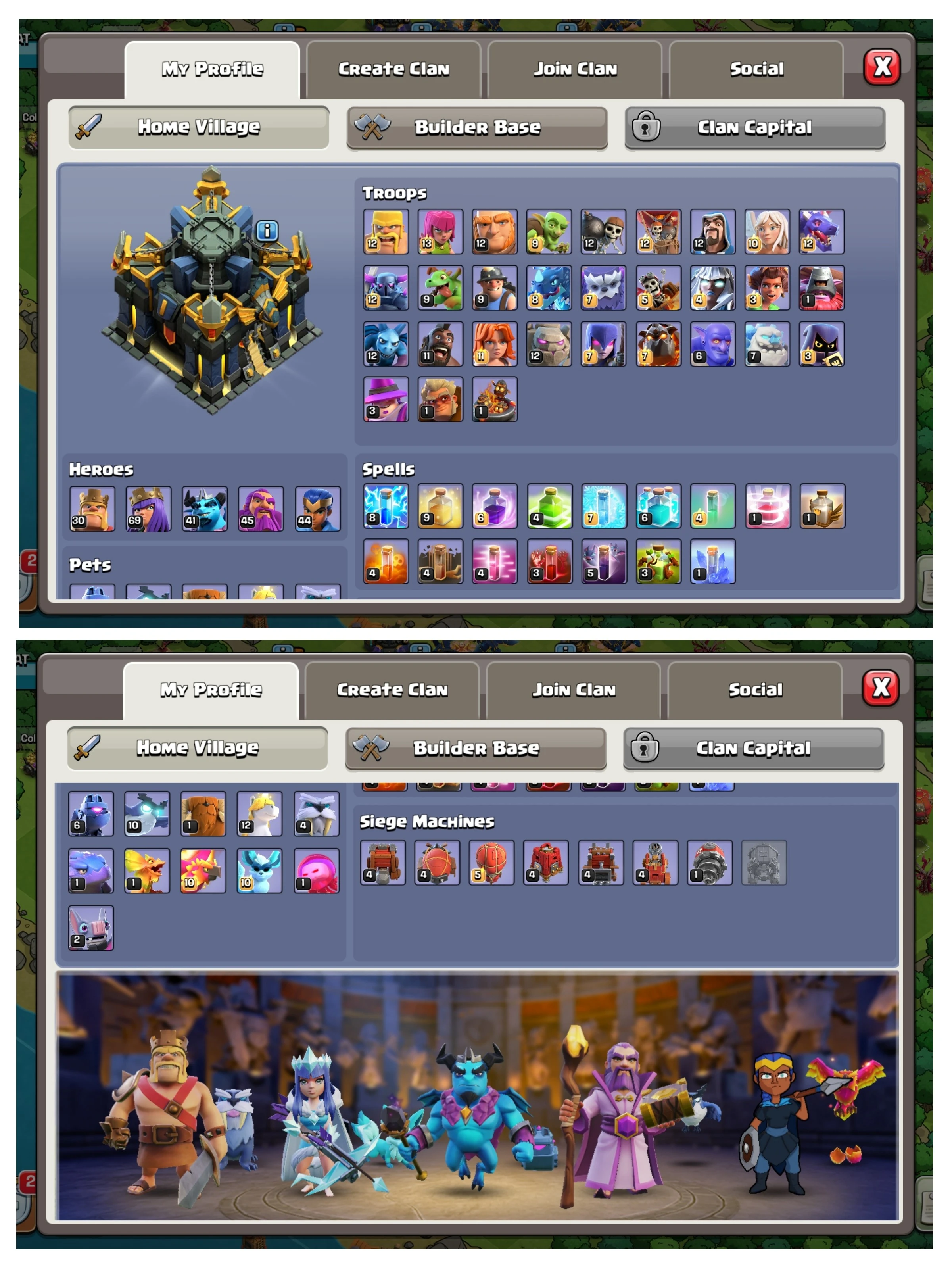 TH17 Account ⚡ Low Price Supersell | Almost All Max Troops | 3 Max Hero Equipment | Paid Hero Skins || 2 Max Pets Included | 1450 War Stars | 209 XP | Fresh Mail | Strong War Base | Hero Levels 30-69-41-45-44 | 60% OFF Today