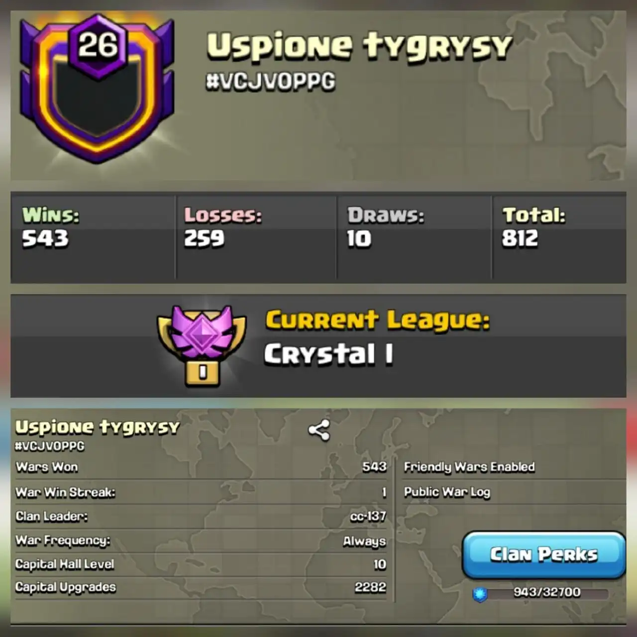 Level 26 clan || clan capital 10 || warlog 543-259 || crystal 1 || name - Uspione tygrysy