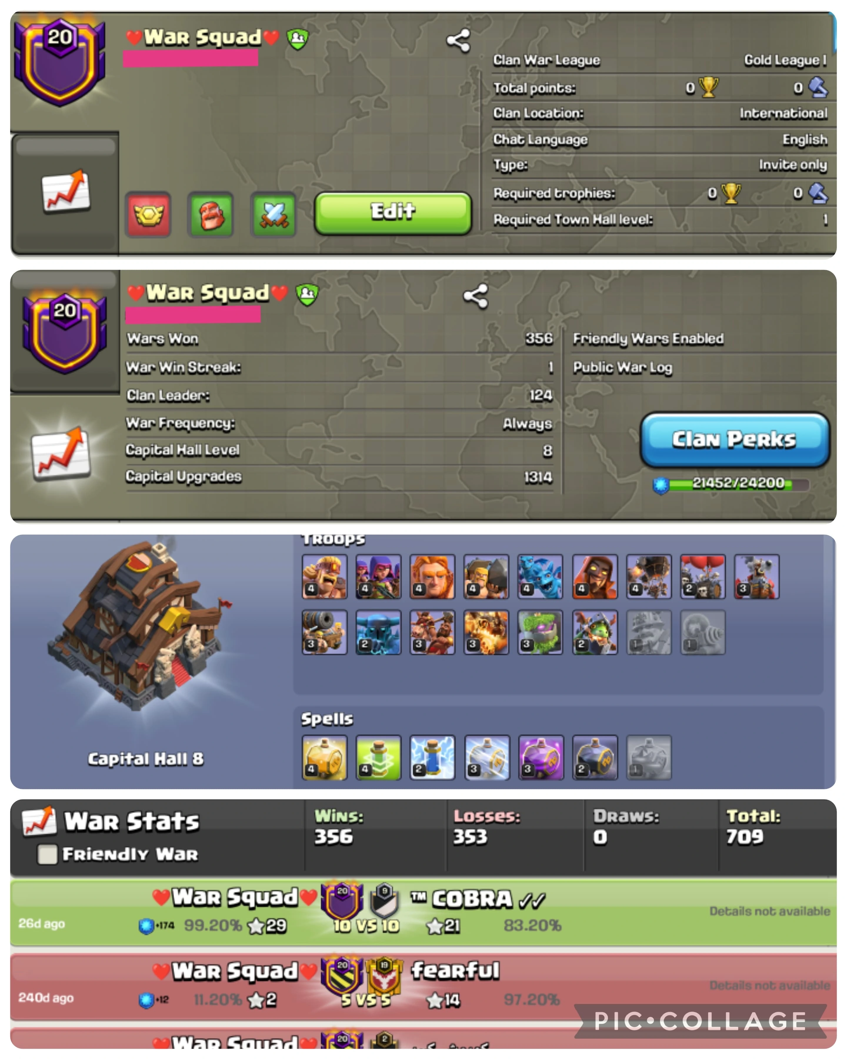 😍LEVEL : 20.9 + CC 8 😝 NAME : WAR SQUAD ☺️ 356 WINS 353 LOSSES 🤗 GOLD 1 😋