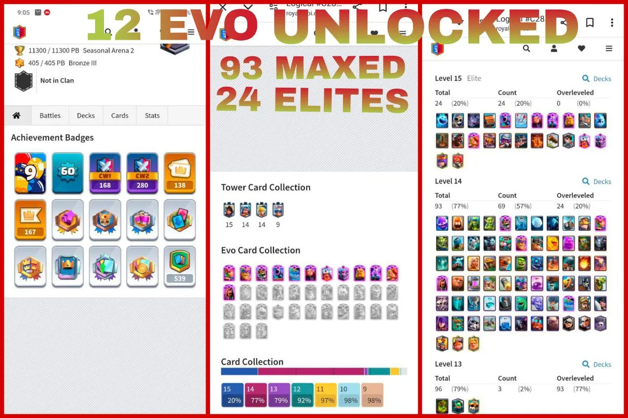 🔥 2 RARE EMOTES 🪐 9 YEAR OLD ACCT 💪11300 TROPHIES 🏆SEASONAL ARENA-2 🏟️ 93 MAX🎴24 ELITES ⚡12 EVOS 💯 XP60-KT15 👑 9 KT SKINS 💠 INSTANT 🚀