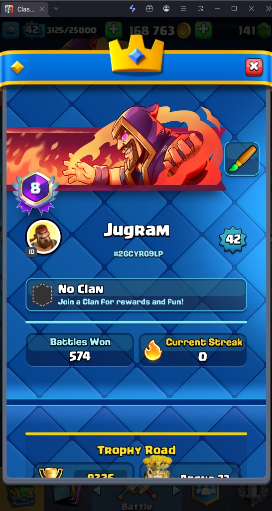 9326 TROPHY 🏆 42 LVL 💯 KT 14 👑 121 CARDS ♦️ 4 MAX CARDS 👑 2 ELITE CARDS  🔮 7 EVO 💯 EMOTE 28 🎭 #2GCYRG9LP ⸱ TAG ACCOUNT ♥️