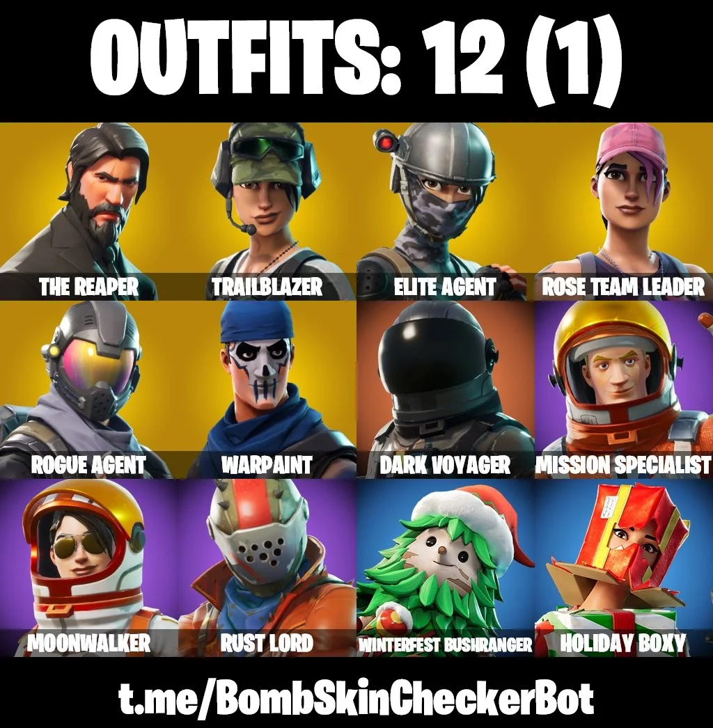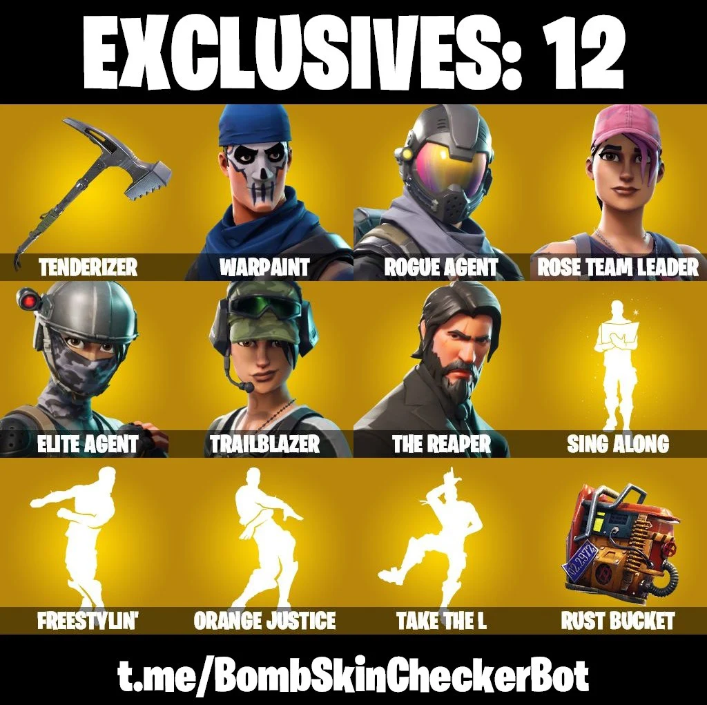 🔮12 Skins🔮 The Reaper💎OG STW💎Take The L💎Trailblazer💎Rogue Agent💎Freestylin💎Elite Agent💎Rust Bucket💎Orange Justice💎Holiday Boxy💎Winterfest Bushranger