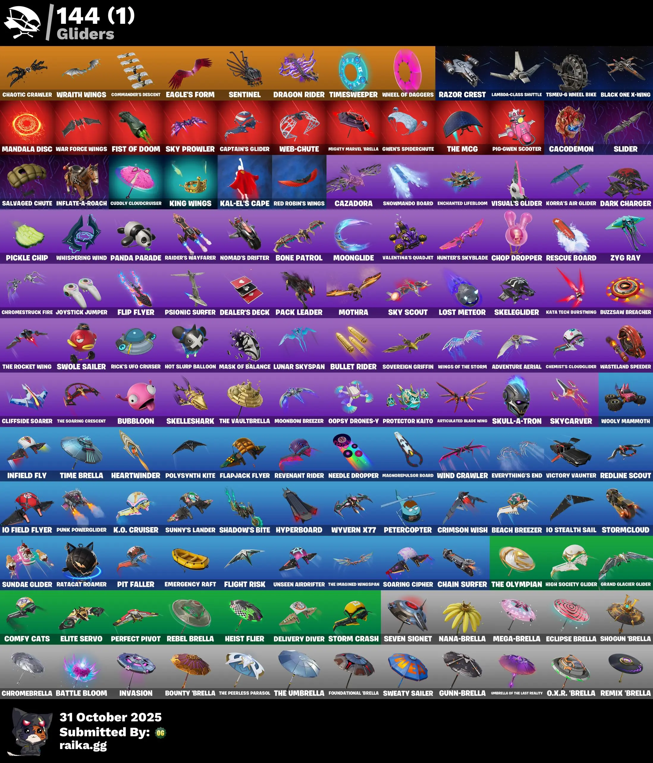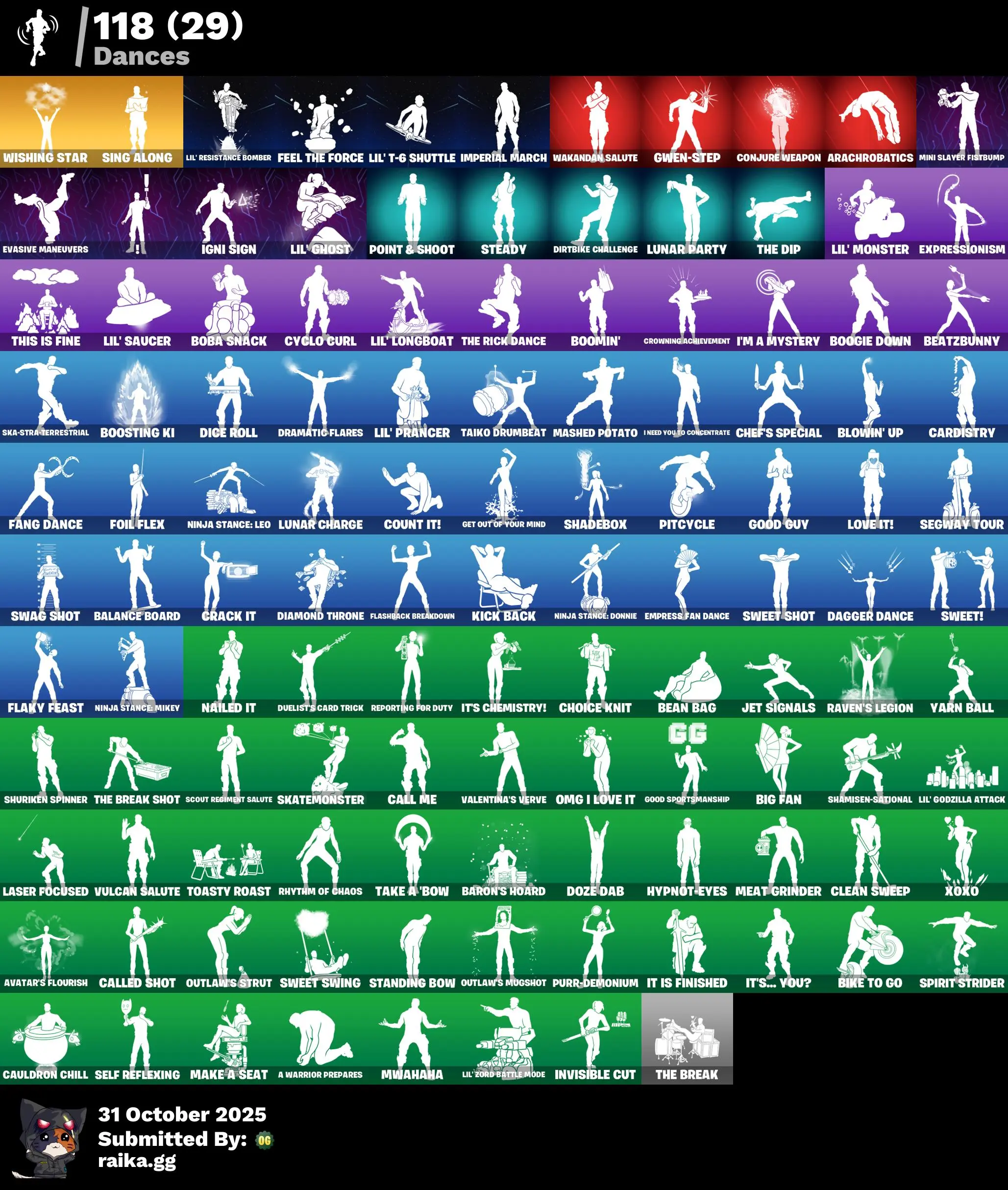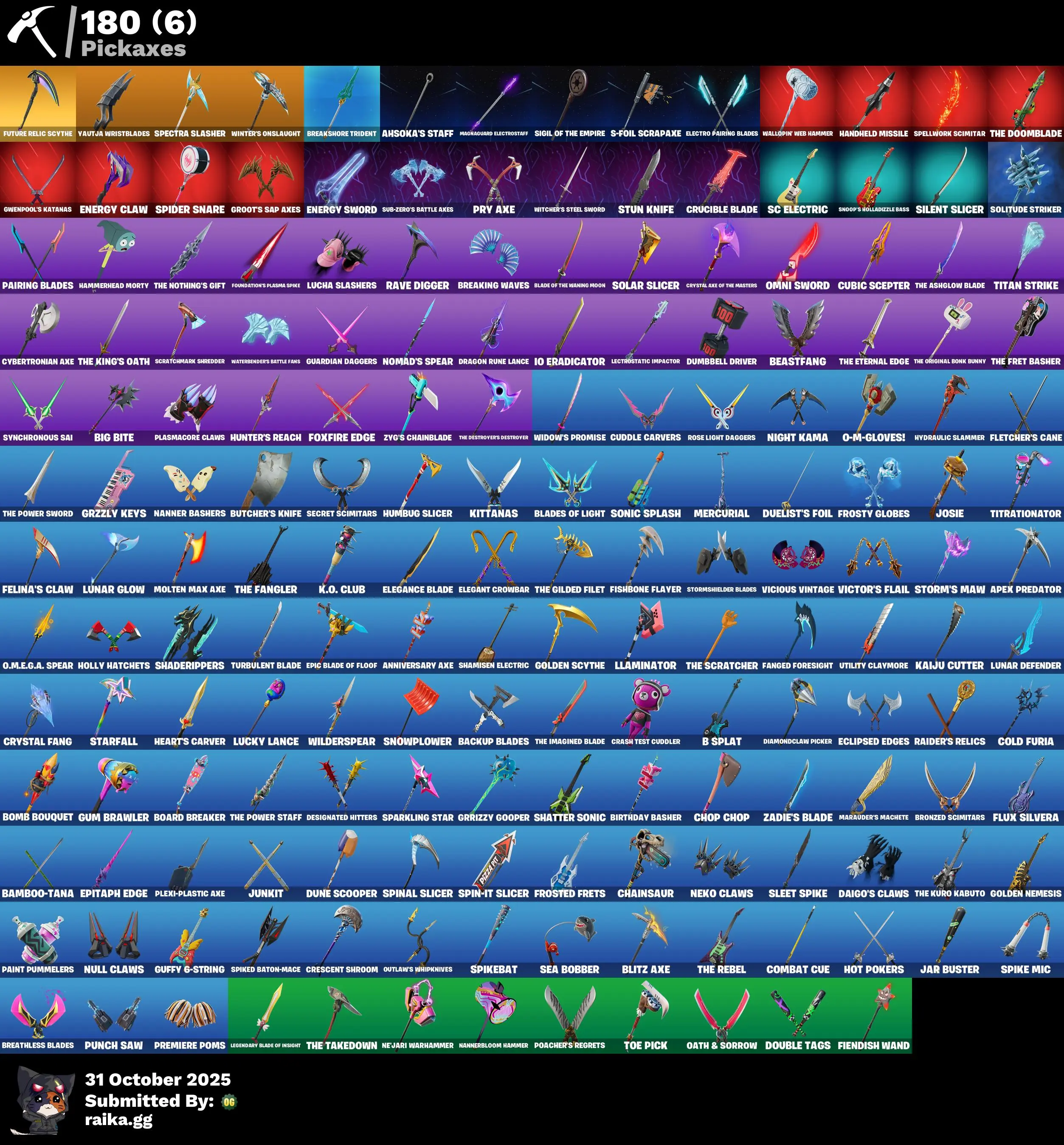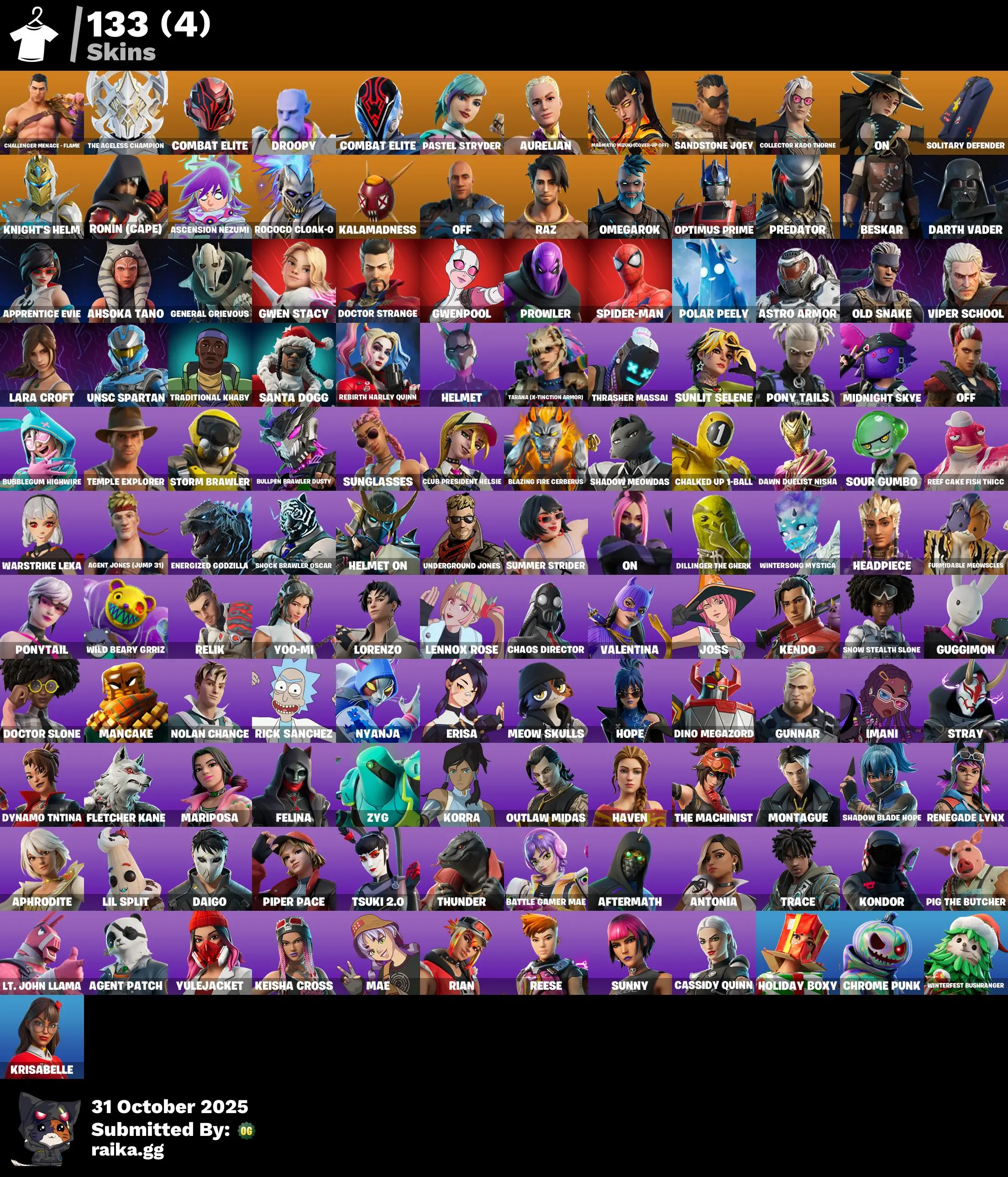 133 skins | Lara Croft🎃Spider-Man🎃Spider-Gwen🎃General Grievous🎃Meat Grinder🎃Cybertronian Axe🎃Mariposa🎃The Scratcher🎃Snoop's Holladizzle Bass🎃The Ashglow Blade🎃Purradise Meowscles🎃Raz🎃Polar Peely🎃UNSC Spartan🎃Snap🎃Era🎃Shanta D5277