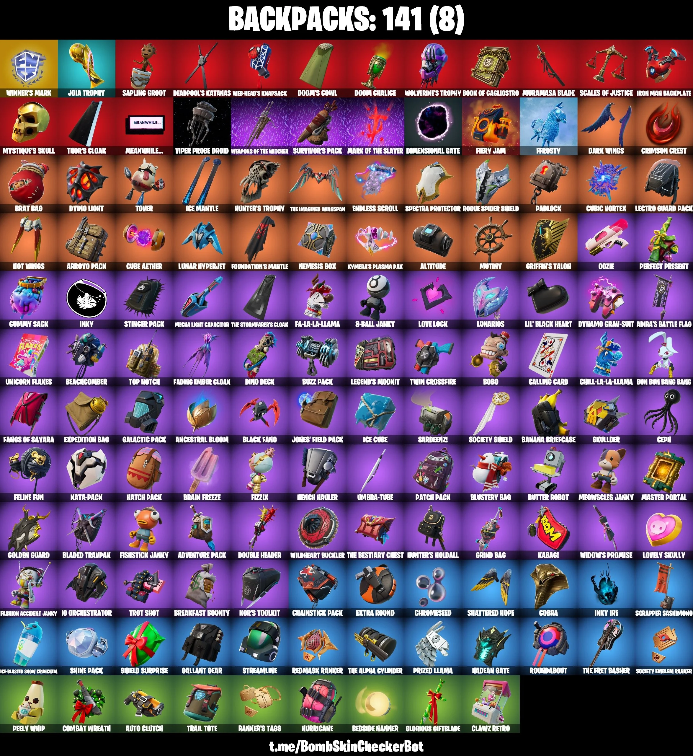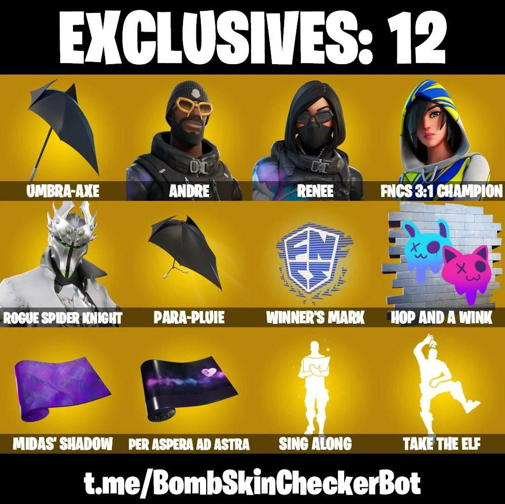 🔮138 Skins🔮 Rogue Spider Knight💎Take The Elf💎Spider Gwen💎Tony Stark💎Darth Vader💎Lara Croft💎Neymar Jr💎Erisa💎Peely💎Polar Peely💎Krisabelle💎Doctor Strange💎Rick Sanchez