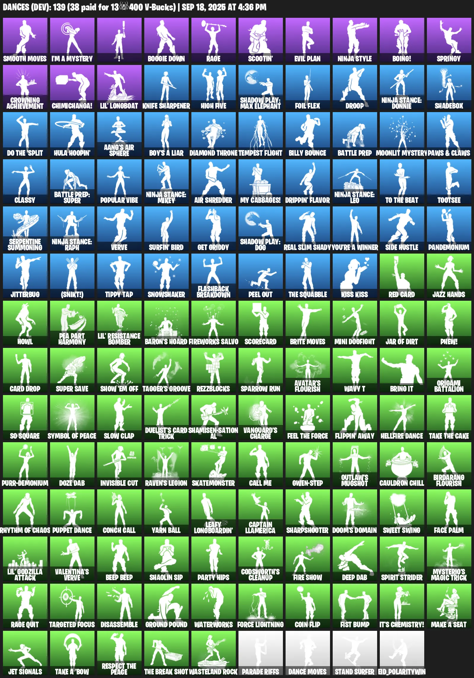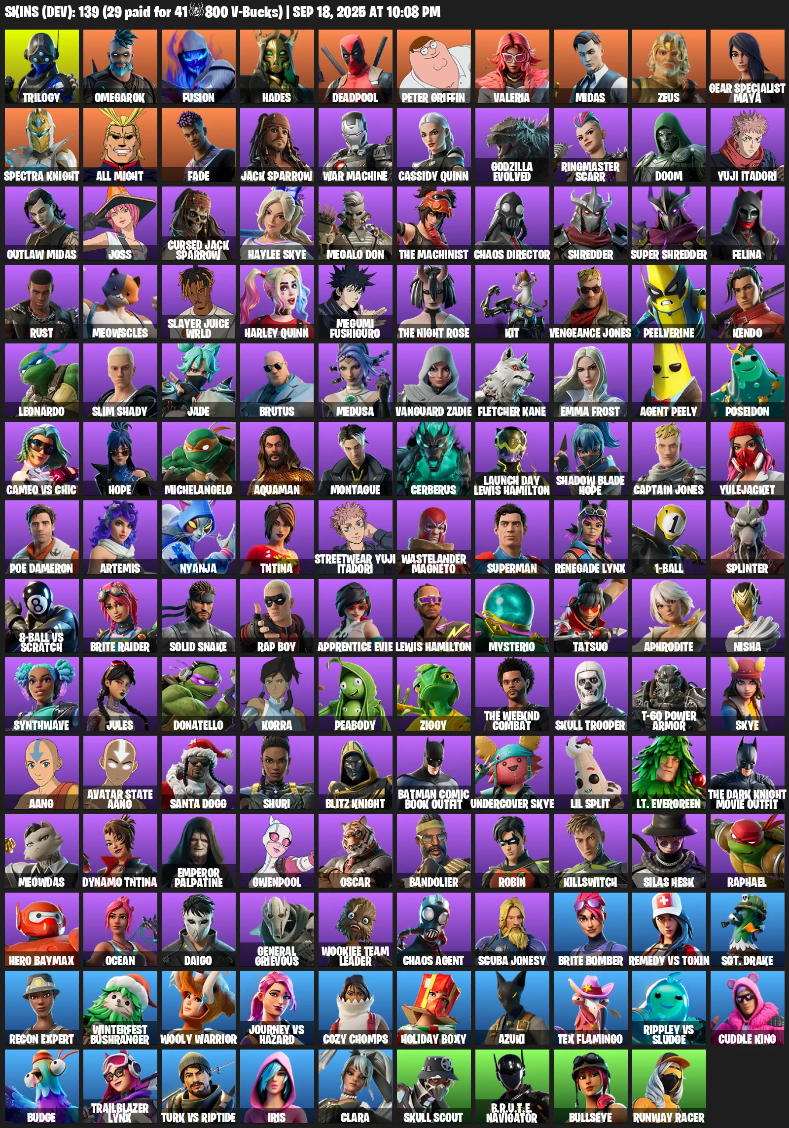 139 SKINS ⸱ For all platforms, Trilogy, Deadpool, Midas, Brutus, Megumi Fushiguro, Leonardo, Michelangelo, Donatello, Avatar State Aang, Batman Comic Book Outfit, Bandolier, Raphael, Trailblazer Lynx