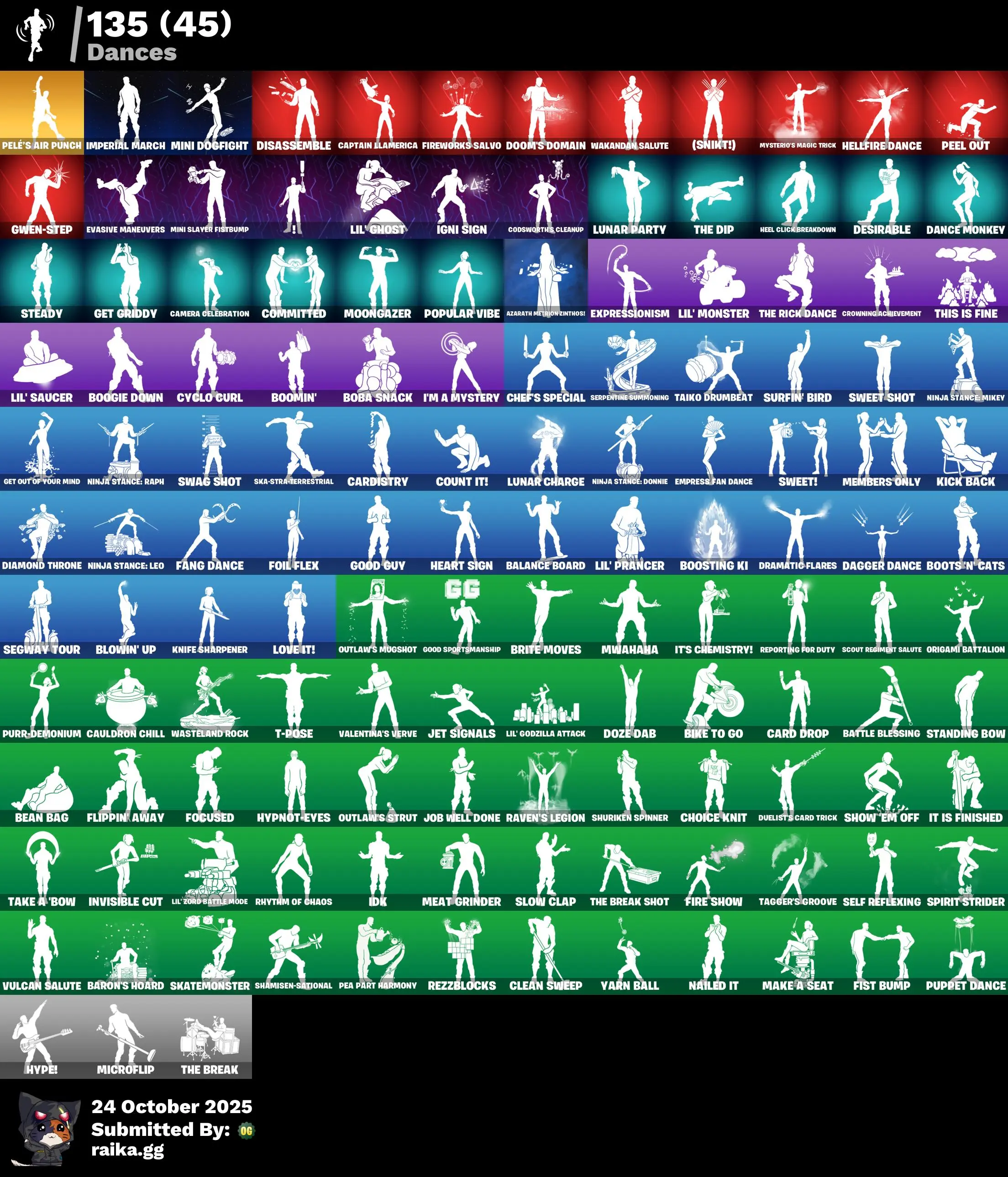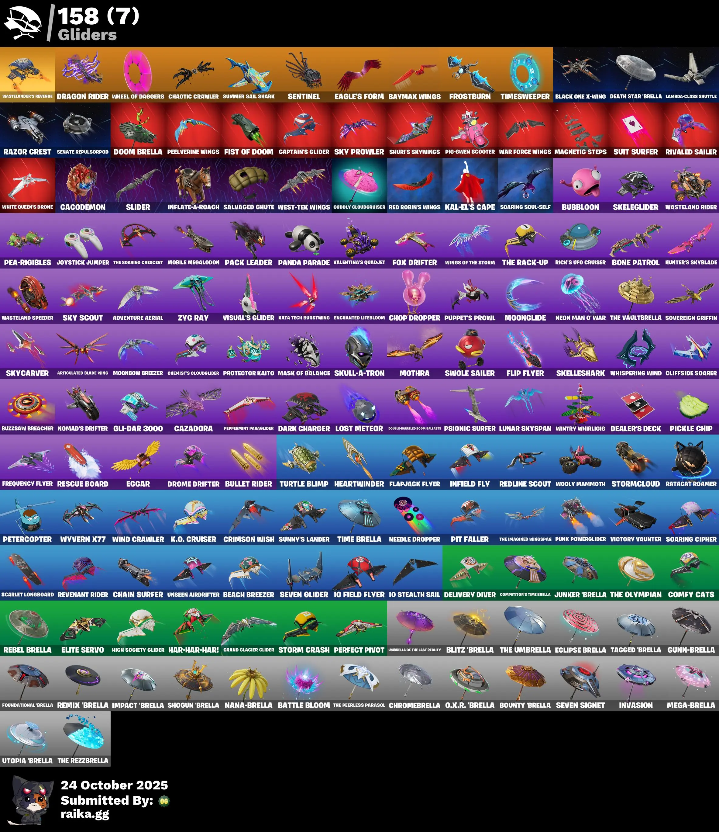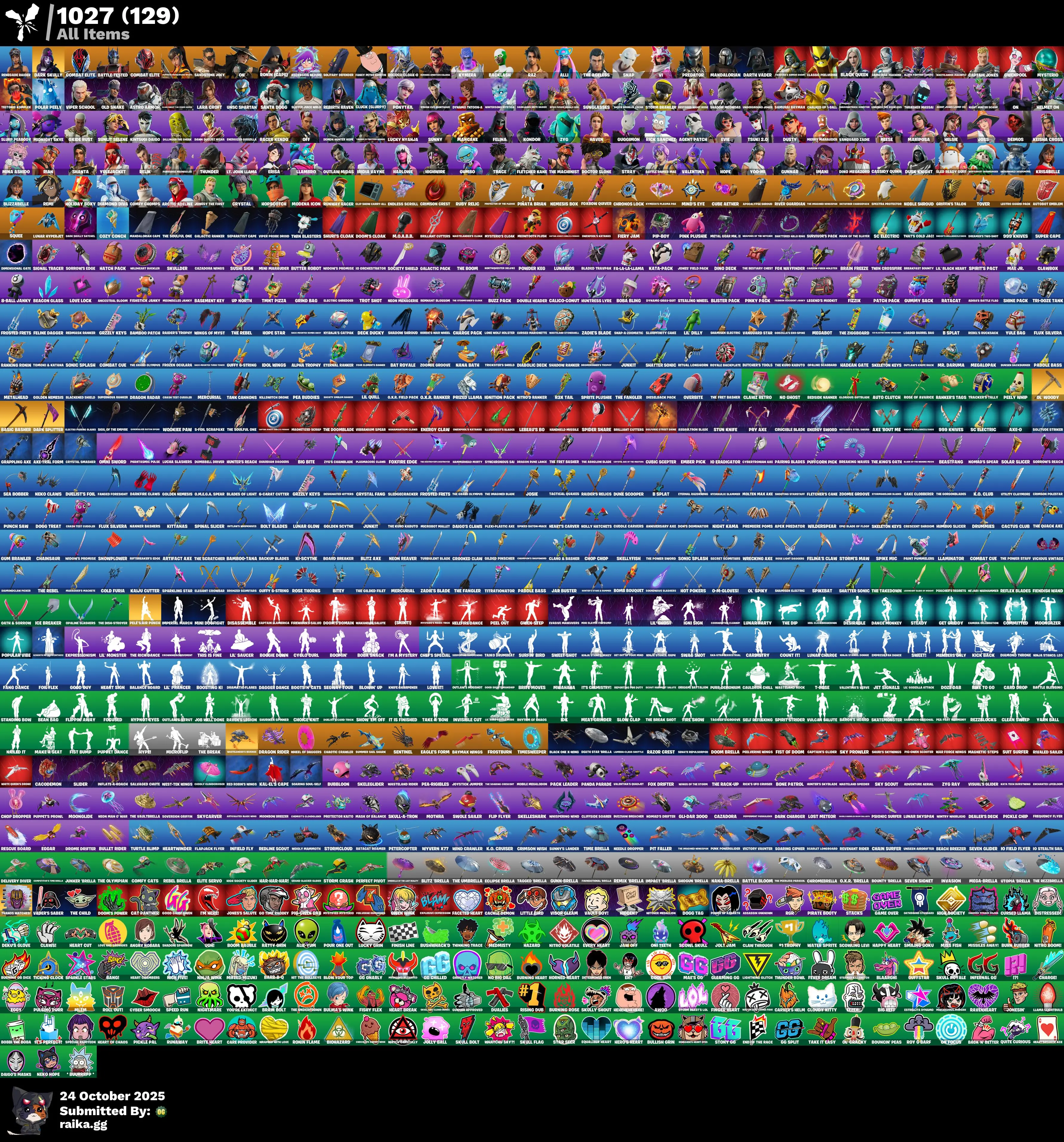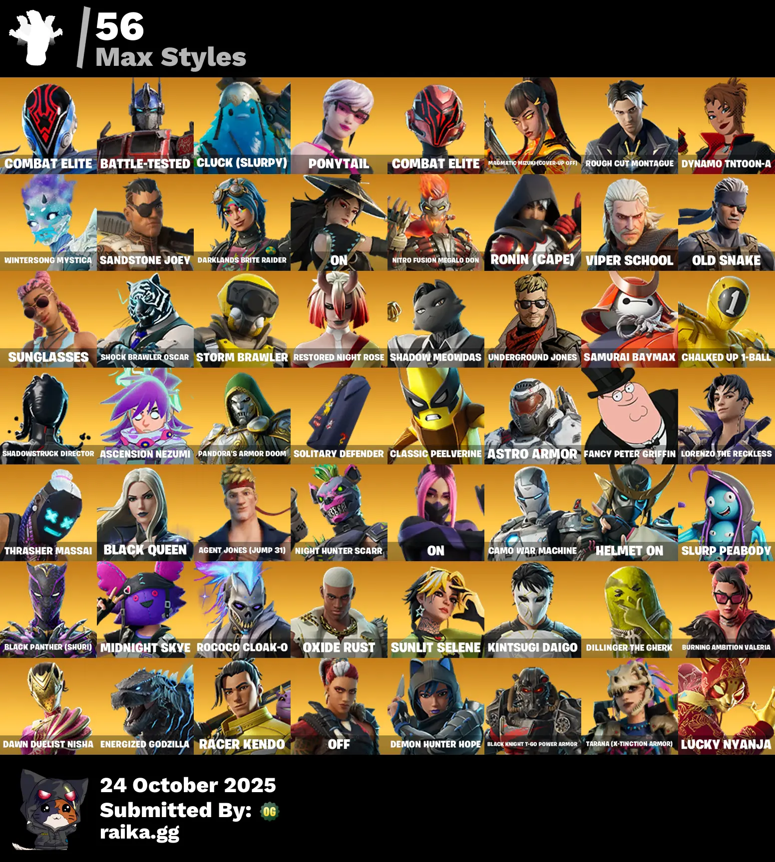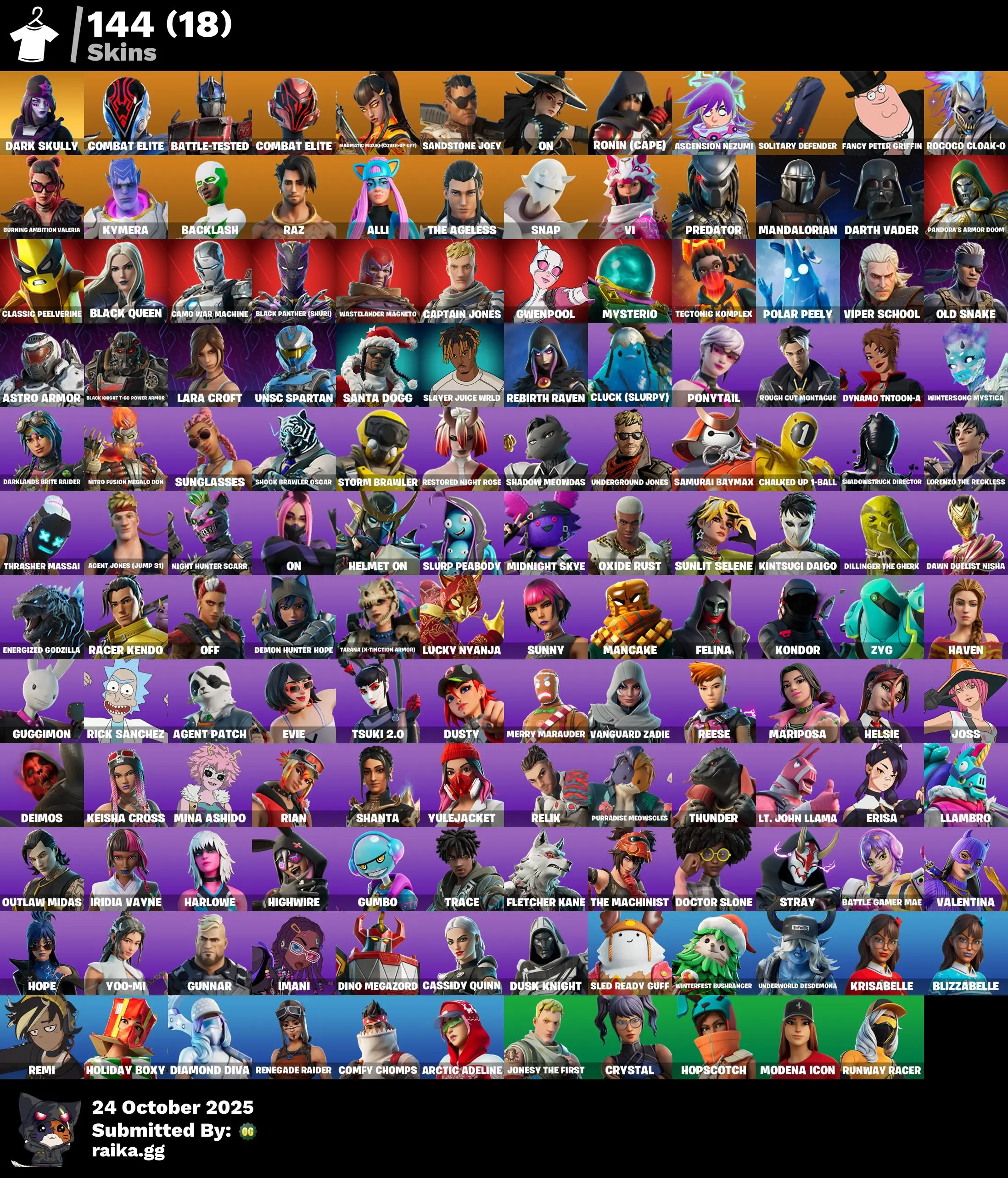 144 skins | Kymera🎃Nezumi🎃The Origin🎃Alli🎃Valeria🎃The Ageless🎃Joey🎃Renzo the Destroyer🎃Ronin🎃Era🎃Mandalorian🎃Peter Griffin🎃Dark Skully🎃Backlash🎃Optimus Prime🎃The Imagined🎃Renegade Raider🎃Mizuki🎃Vi🎃Snap🎃Predator🎃Darth Vader D5180