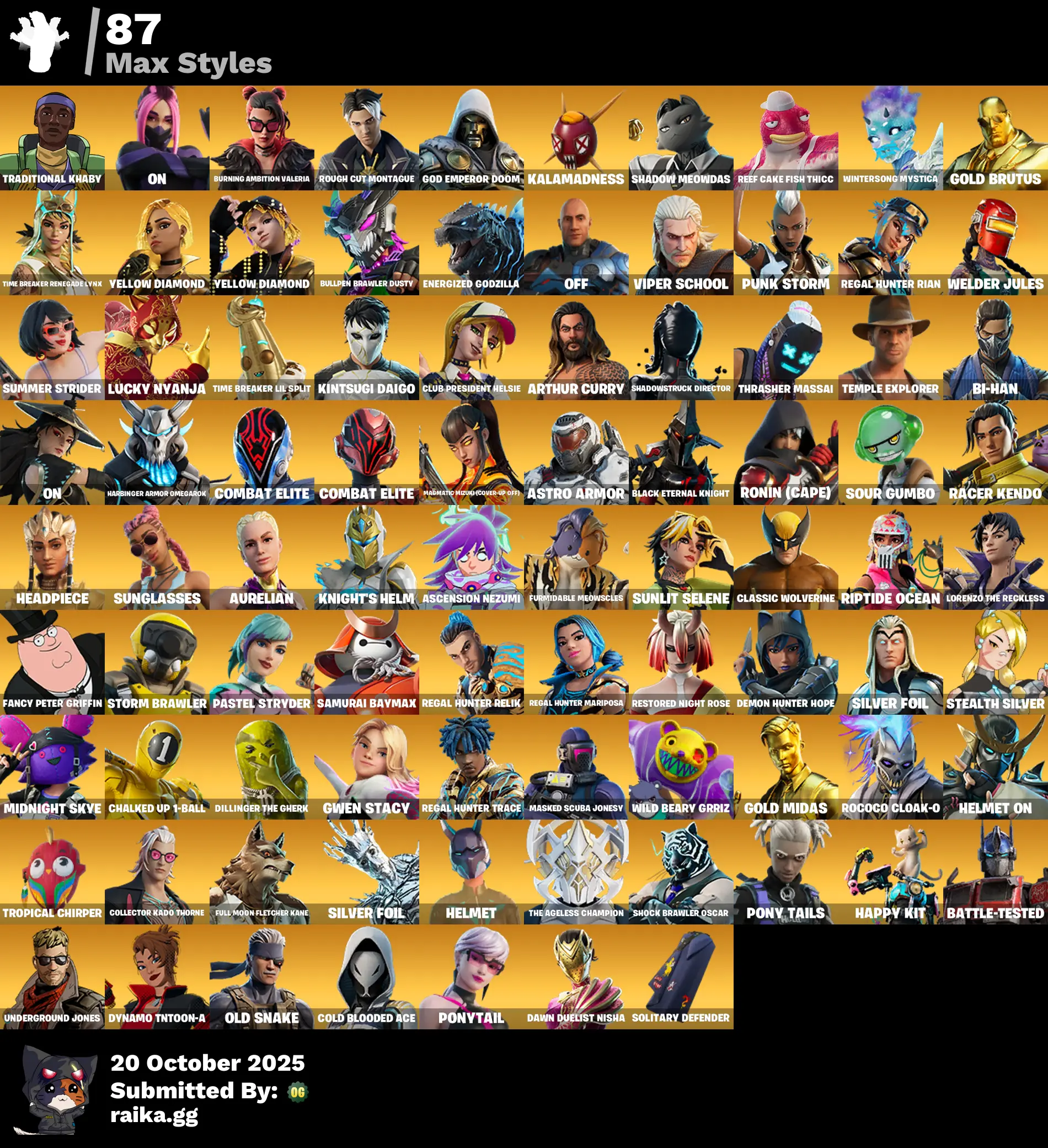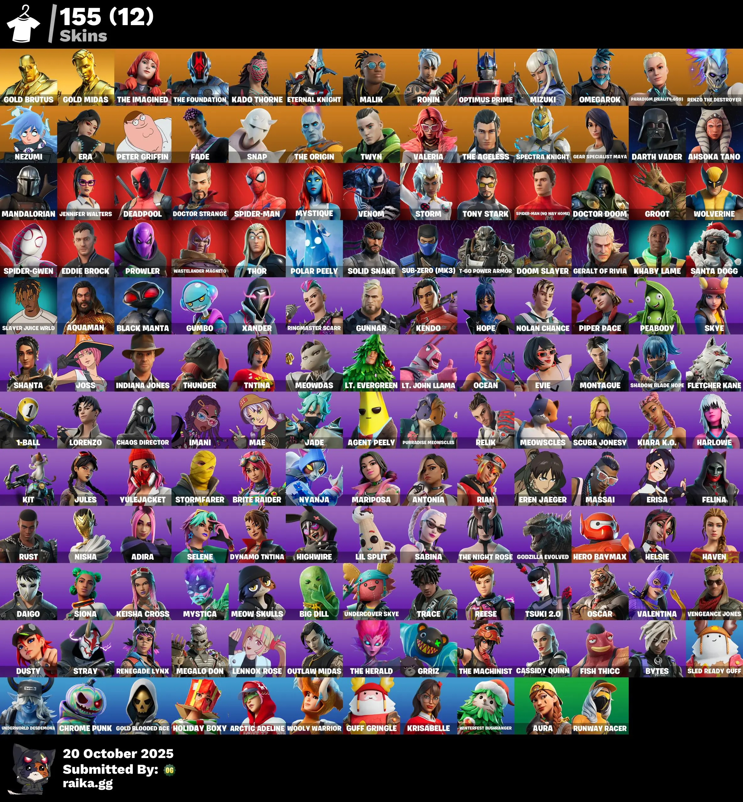 155 skins | The Ageless🎃Verve🎃Astro Jack🎃Fade🎃Gold Midas🎃Peter Griffin🎃Nezumi🎃Malik🎃Snap🎃Gold Brutus🎃Kado Thorne🎃Astroworld Cyclone🎃Twyn🎃The Foundation🎃Ronin🎃Valeria🎃Mizuki🎃Nanner Ringer🎃Lazer Blast🎃Eddie Brock D3739