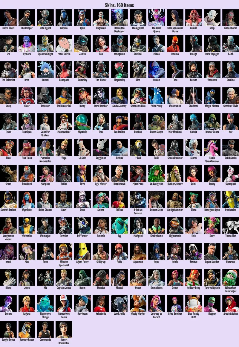 160 Skins|Travis Scott|The Reaper|Elite Agent|Sultura|Lynx|Ragnarok|Renzo the Destroyer|The Ageless|The Cube Queen|Gear Specialist Maya