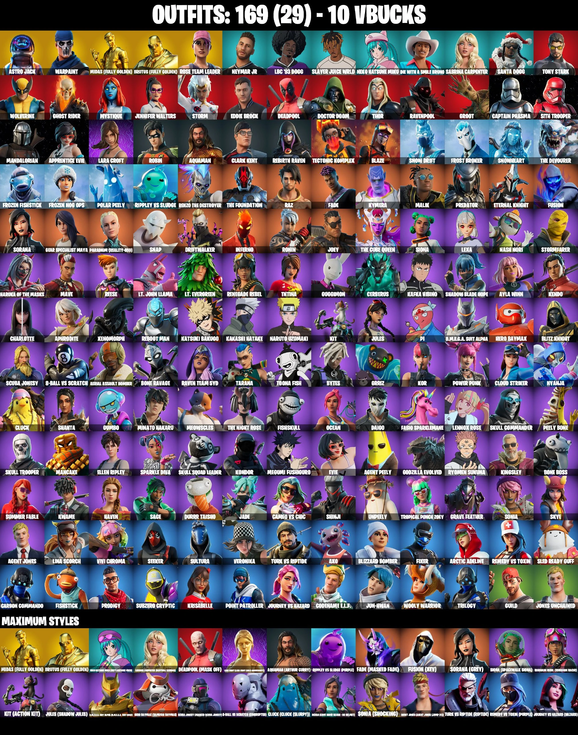 169 SKINS | ASTRO JACK | OG STW FOUNDERS | GOLDEN LARA CROFT | SKULL TROOPER | GHOST RIDER | RAVENPOOL | CAPTAIN PHASMA | SITH TROOPER | MANDALORIAN | APPRENTICE EVIE | NEKO HATSUNE MIKU MAX | KAFKA | KATSUKI | KAKASHI | NARUTO |
