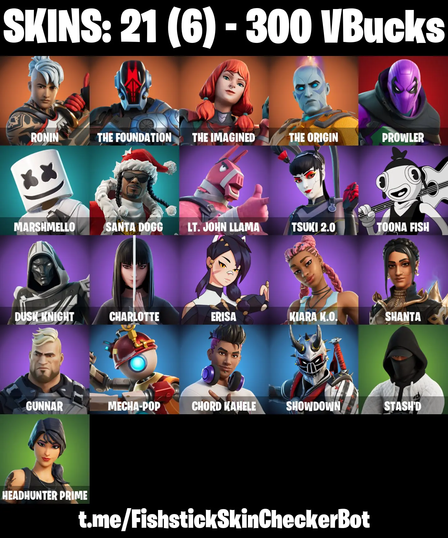 🔥 21 skins [PC/PSN/XBOX] ⚔️ Ronin 🏛️ The Foundation 🌌 The Imagined 🧬 The Origin 🕷️ Prowler 🎧 Marshmello 🎅 Santa Dogg 🦙 Lt. John Llama 🤖 Tsuki 2.0 💰| AGCFN143