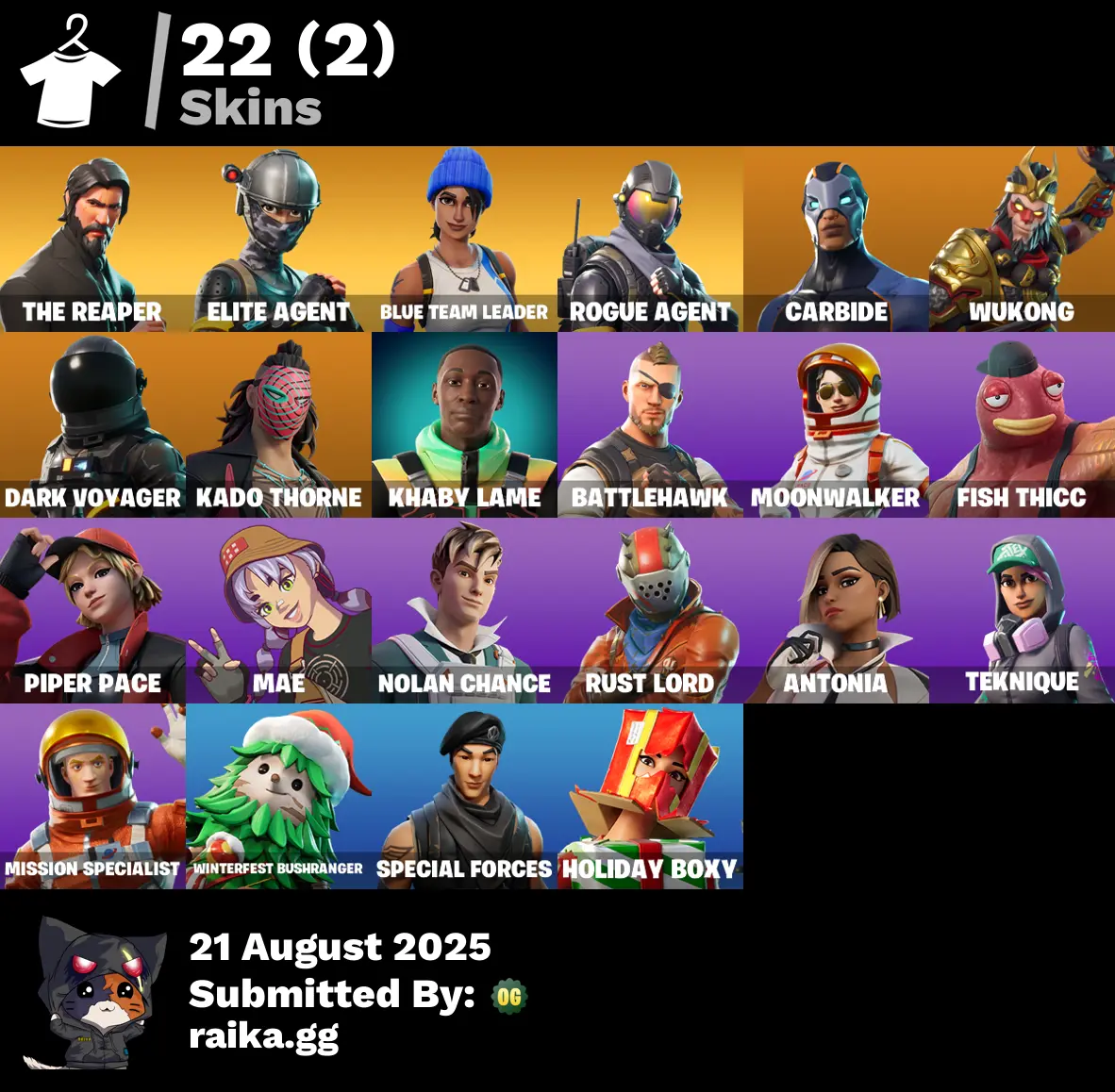 22 skins | The Reaper❄️Take The L❄️Elite Agent❄️Orange Justice❄️Popcorn❄️Birthday Basher❄️Kado Thorne❄️Moonwalker❄️Felina's Claw❄️Sawtooth❄️Crowning Achievement❄️Foil Flex❄️Dark Voyager❄️Sweet!❄️Winterfest Bushranger❄️Teknique❄️Special Forces D4567