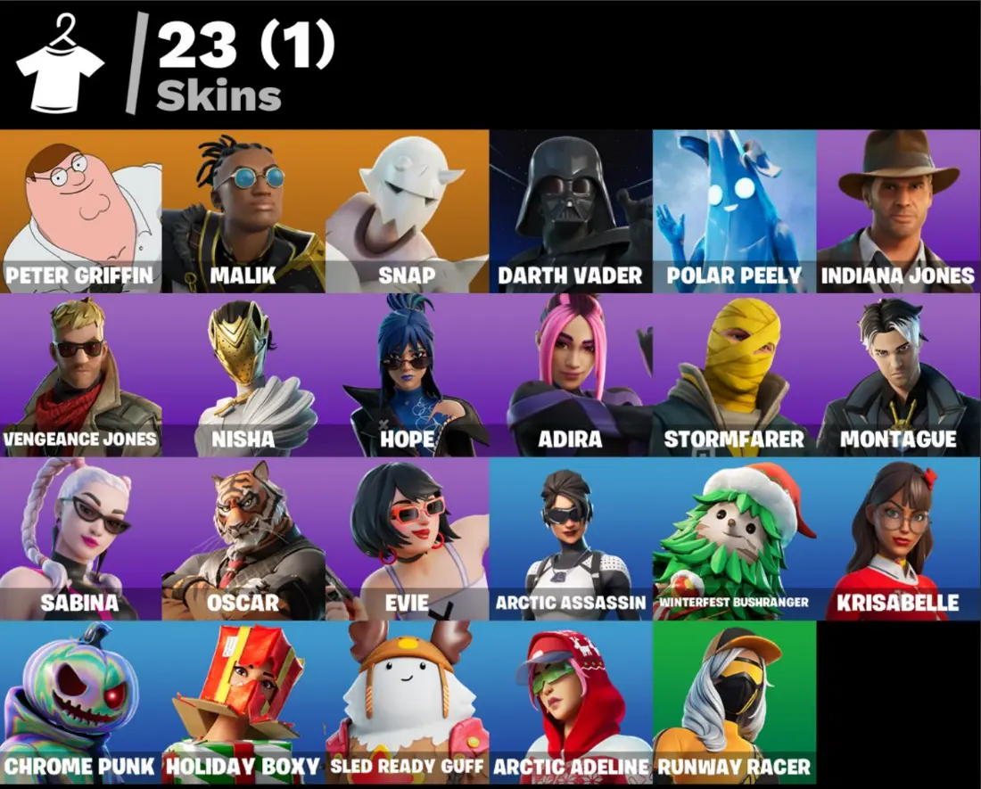 23 SKINS ⸱ For all platforms | Peter Griffin | Malik | Snap | Darth Vader | Polar Peely | Indiana Jones | Vengeance Jones | Nisha | Hope | Adira | Stormfarer