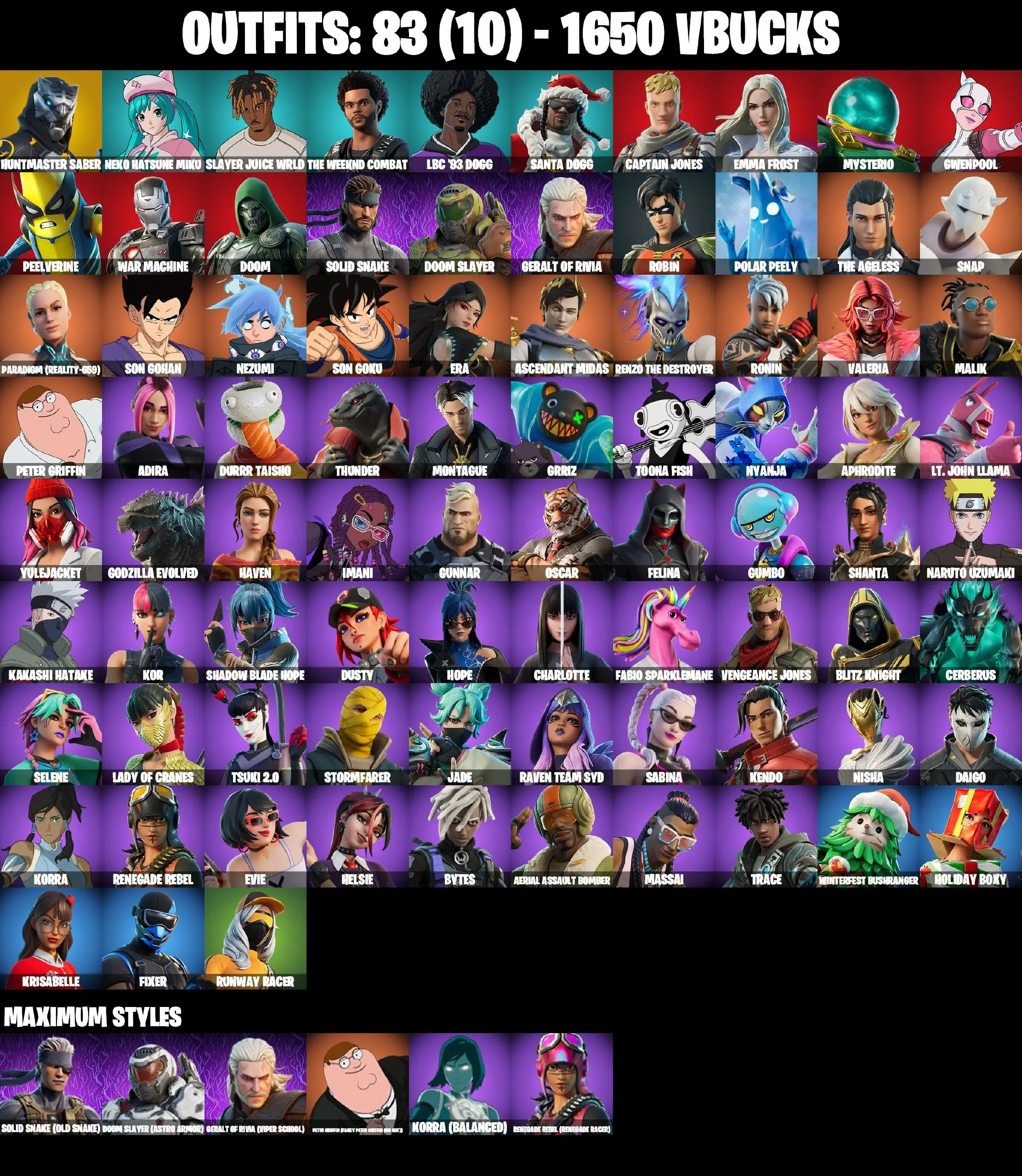 83 SKINS | HANTMASTER SABER | BTS EMOTE | NARUTO | KAKASHI | SON GOKU | SON GOHAN | ASTROWORLD CYCLONE | NEKO HASTUNE MIKU | CHARLOTTE | KOR | LADY OF CRANES | TSUKI 2.0 | TOONA FISH | DURRR TAISHO | CAN PLAY ON PSN,XBOX,PC,NINTEN