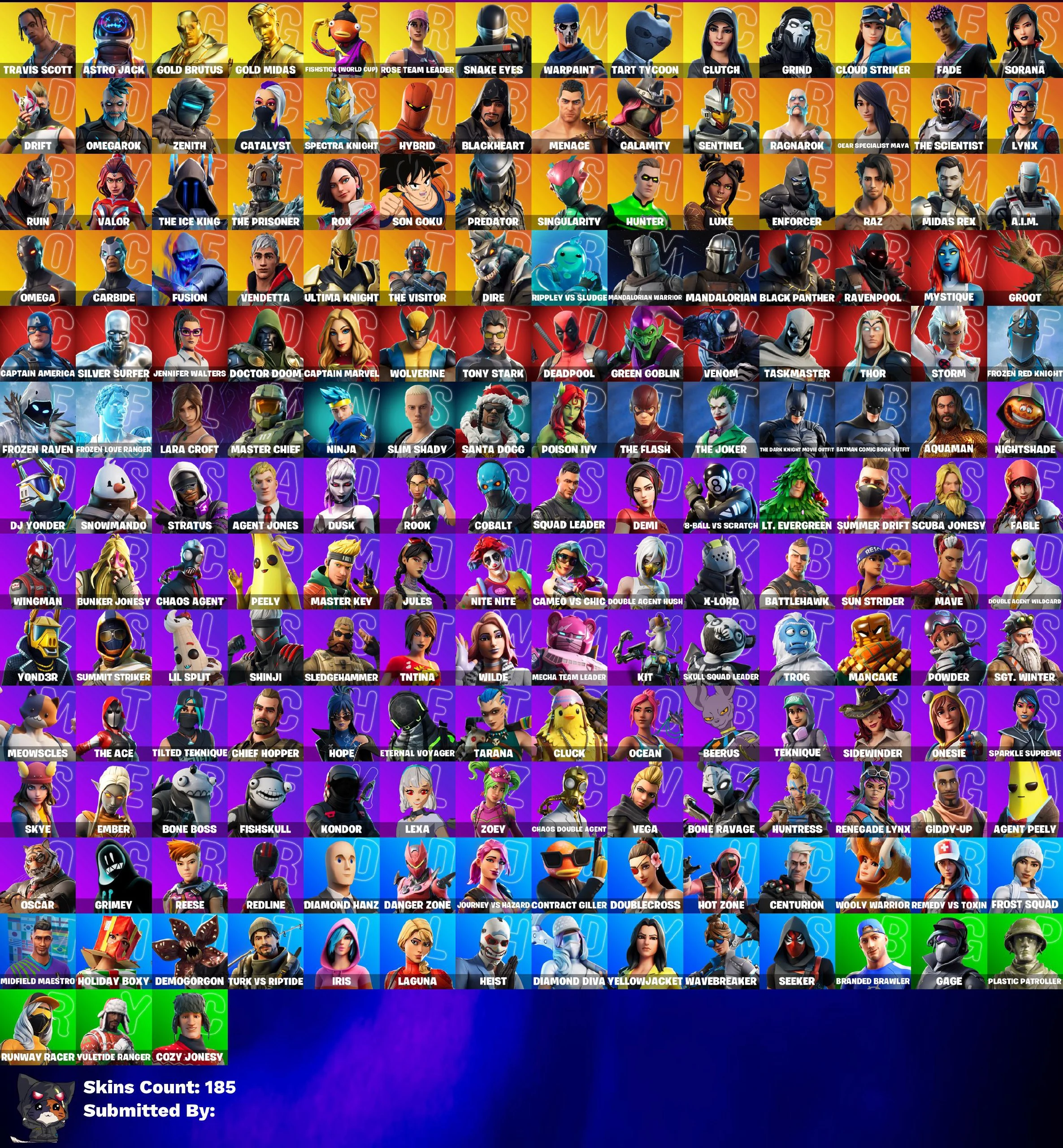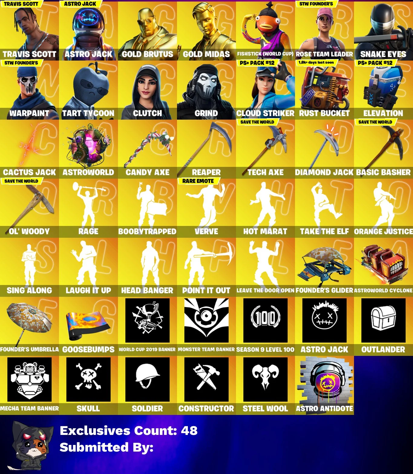 π₯π EXCLUSIVE OFFER ππ₯ 185 SKINS π TRAVIS SCOTT π MASTER CHIEF π ASTRO JACK π GOLD BRUTUS π GOLD MIDAS π FISHSTICK (WORLD CUP) π SNAKE EYES π TART TYCOON π CLUTCH π GRIND π CLOUD STRIKER π FADE π SORANA π DRIFT π REAPER π 290 VB π OG STW π FULL ACCESS π