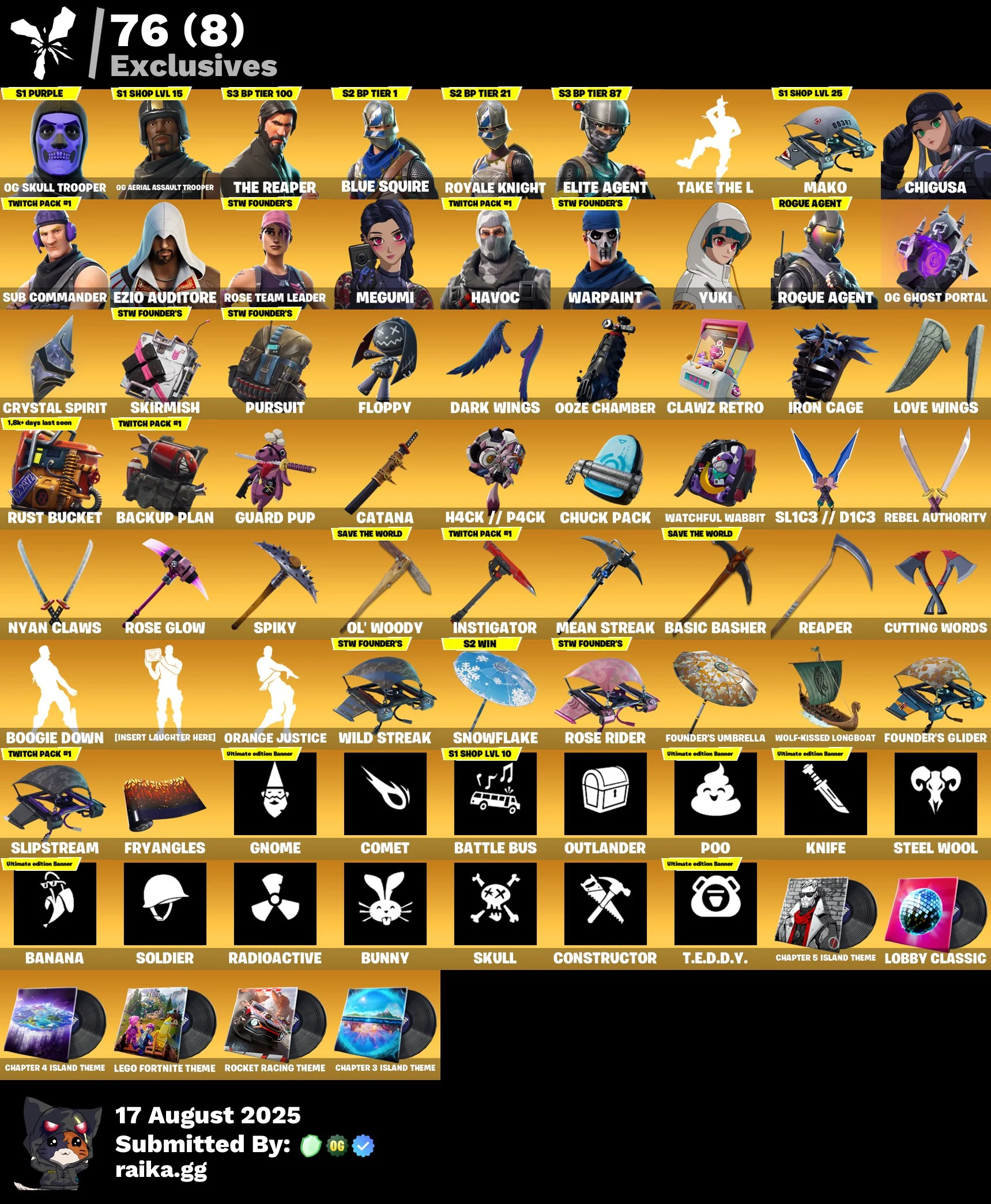 💥🌟💥 EXCLUSIVE OFFER 💥🌟💥 48 SKINS 💎 OG SKULL TROOPER PURPLE 💎 OG AERIAL ASSAULT TROOPER (OG STYLE) 💎 THE REAPER 💎 TAKE THE L 💎 BLUE SQUIRE 💎 ROYALE KNIGHT 💎 ELITE AGENT 💎 SUB COMMANDER 💎 FULL ACCESS