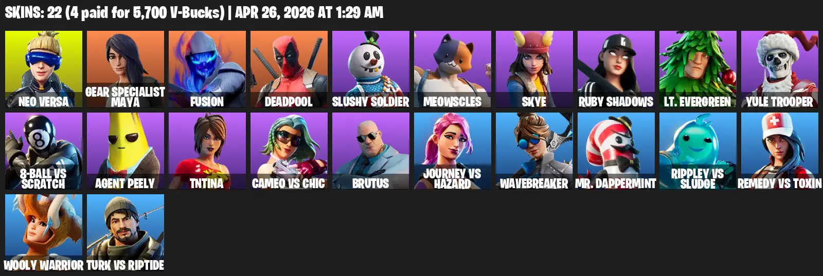 🔥 [PC] | 22 Skins | Meowscles / Neo Versa / Gear Specialist Maya / Fusion / Deadpool / Slushy Soldier / Skye / Ruby Shadows / Lt. Evergreen / Yule Trooper | Full Access