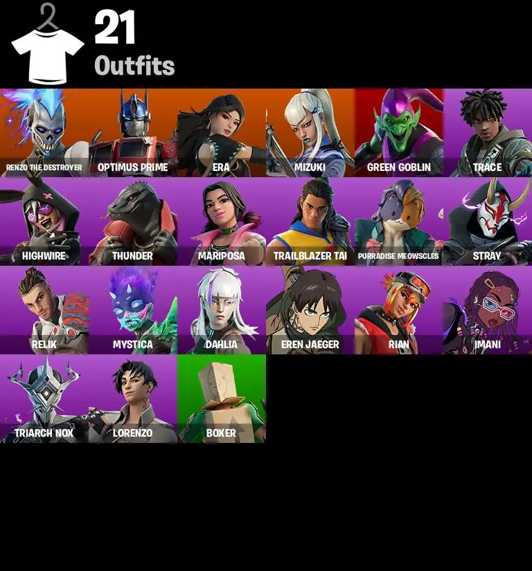 【PC/NS/XBOX/PSN】 21 SKINS 🔥 RENZO THE DESTROYER 🔥 OPTIMUS PRIME 🔥 ERA 🔥 MIZUKI 🔥 GREEN GOBLIN 🔥 HIGHWIRE 🔥 DAHLIA 🔥 MYSTICA 🔥 RELIK 🔥 150 VB