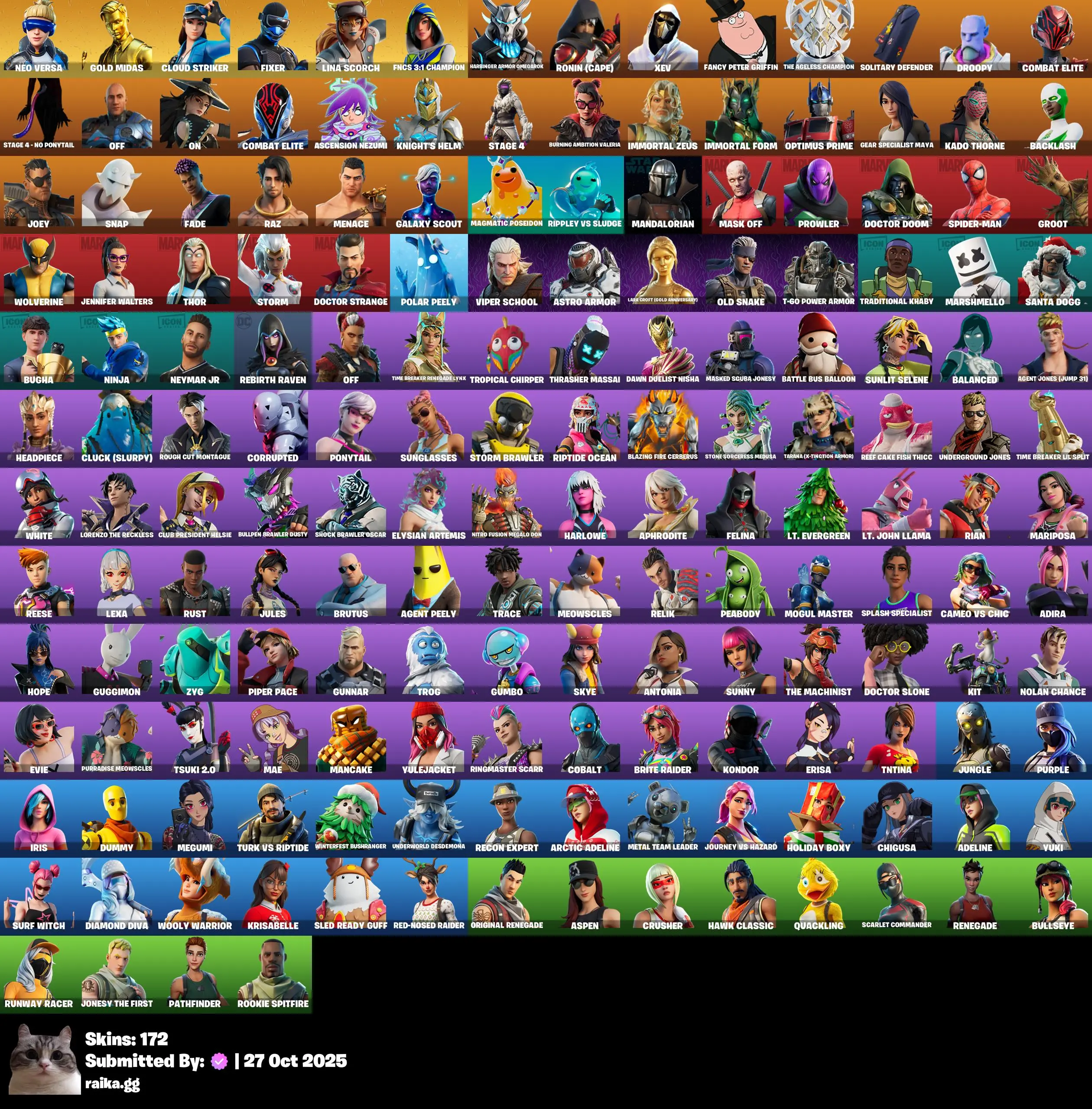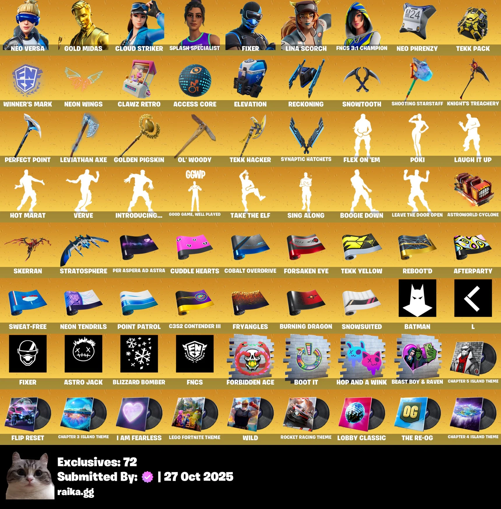 [PC/PSN/XBOX] 172 skins | Leviathan Axe | Neo Versa | Gold Midas | Cloud Striker | Fixer | Lina Scorch | FNCS 3:1 Champion | Harbinger Armor Omegarok | Ronin (Cape) |