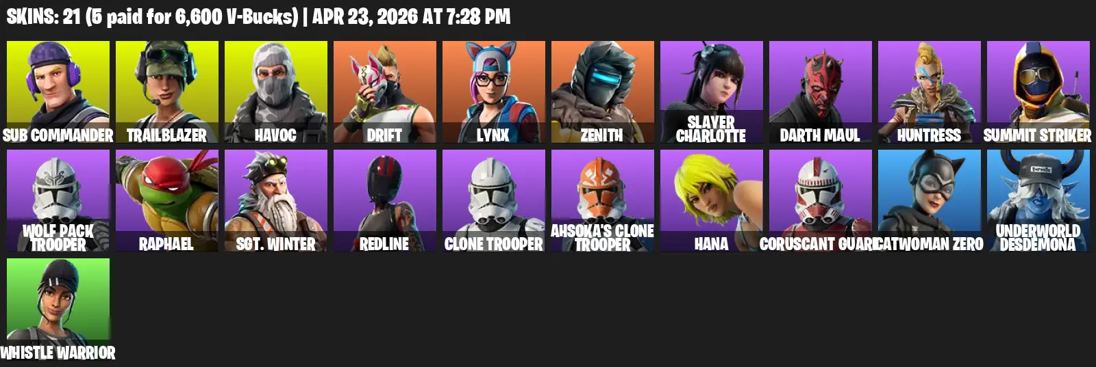 (PC/PSN/XBOX) 21 Skins | Sub Commander, Trailblazer, Havoc, Drift, Lynx, Zenith, Slayer Charlotte, Darth Maul, Huntress | FULL ACCESS