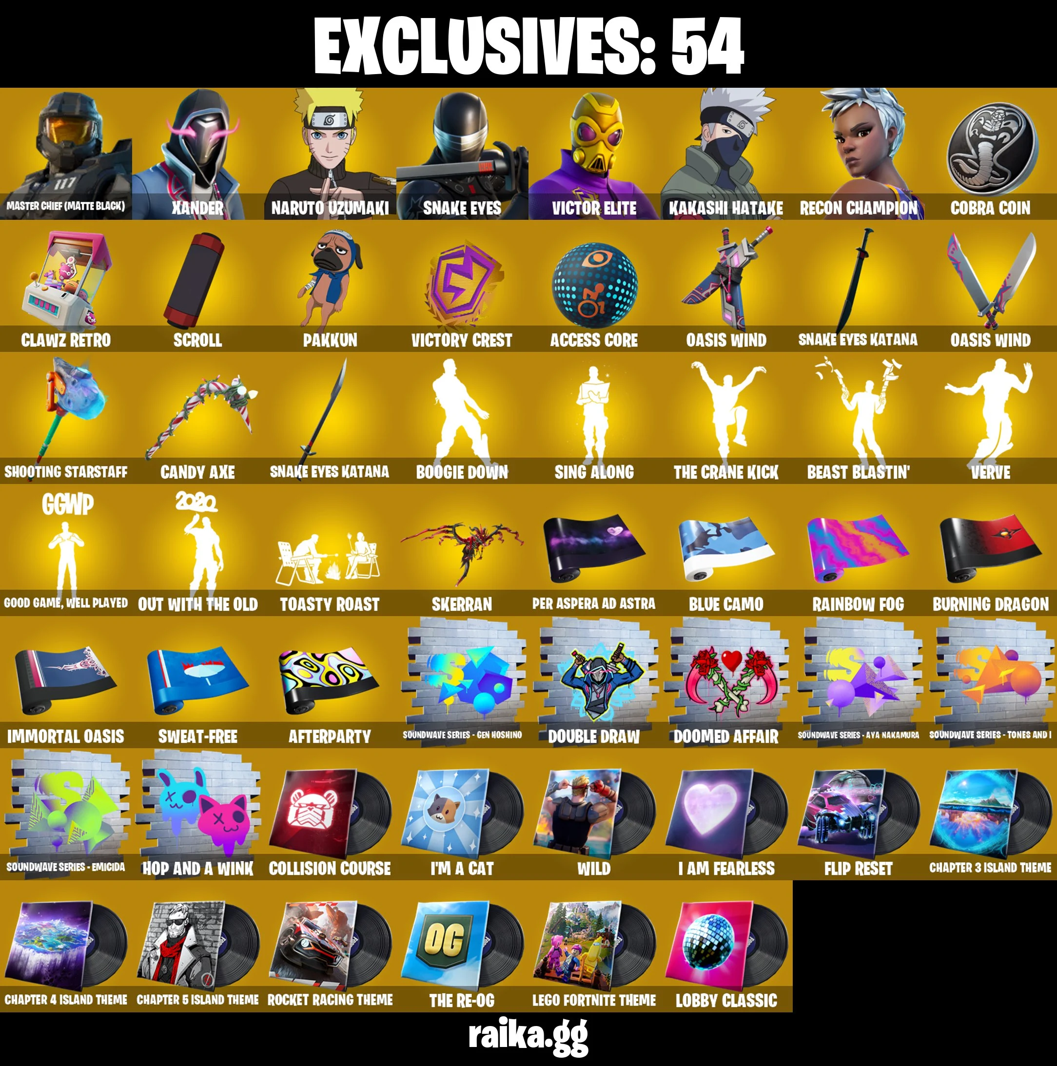 ✨ [PC/PSN/XBOX] 221 skins | parent email ( have code ) | Master Chief (Matte Black) | Xander | Naruto Uzumaki | Kakashi Hatake | Snake Eyes | Victor Elite | Recon Champion | Raz | Optimus Prime | Torin | 50 VB