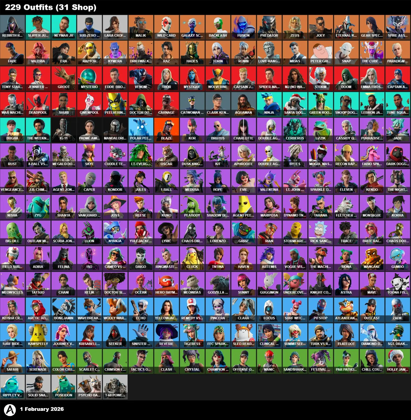| PC/PSN/XBOX | 229 Skins | Lara Croft | Rebirth Raven | Sub-Zero | Juice WRLD | Neymar Jr | Ninja | Santa Dogg | Green Roots Billie | Snoop Dogg | LeBron James | Tune Squad LeBron | Bugha