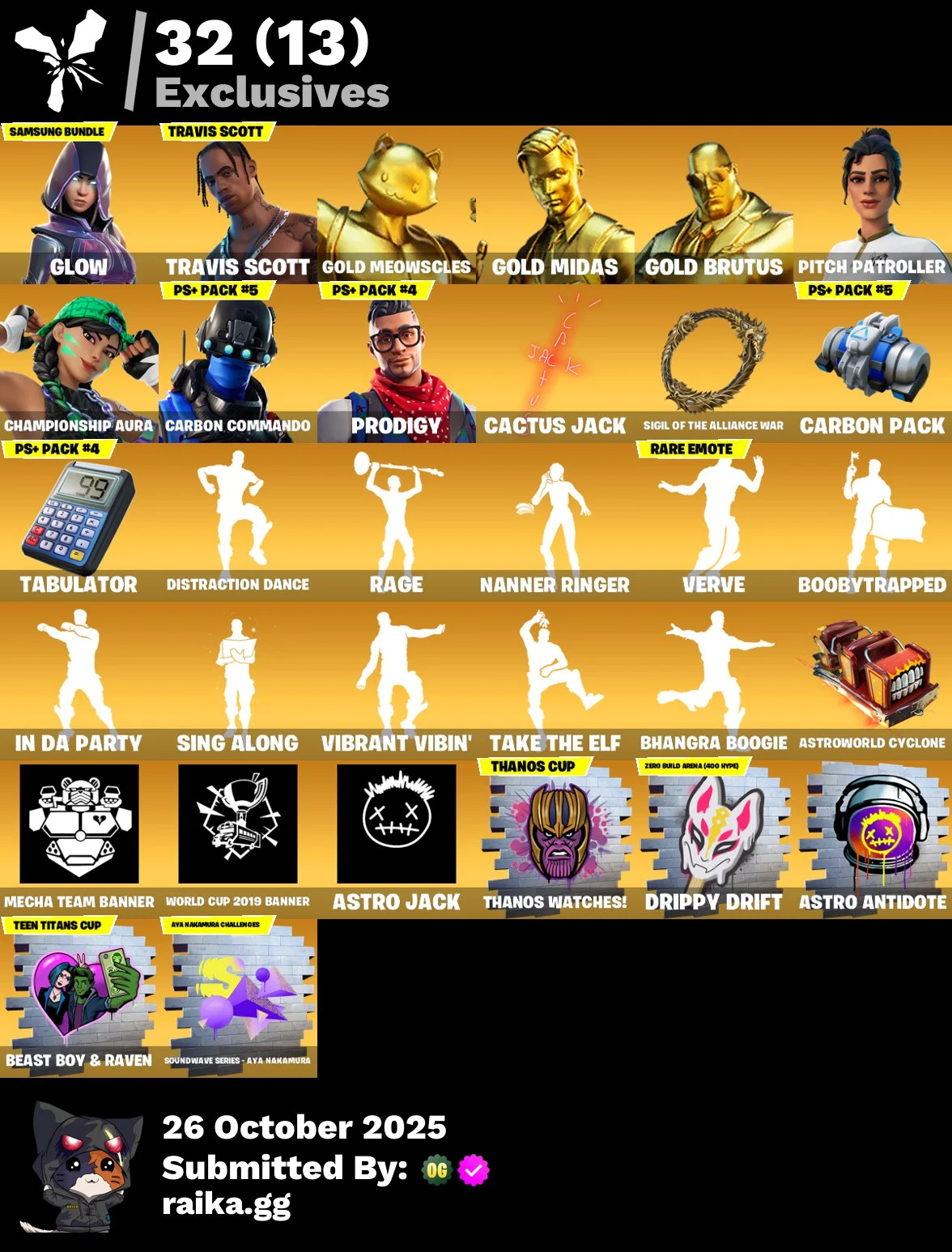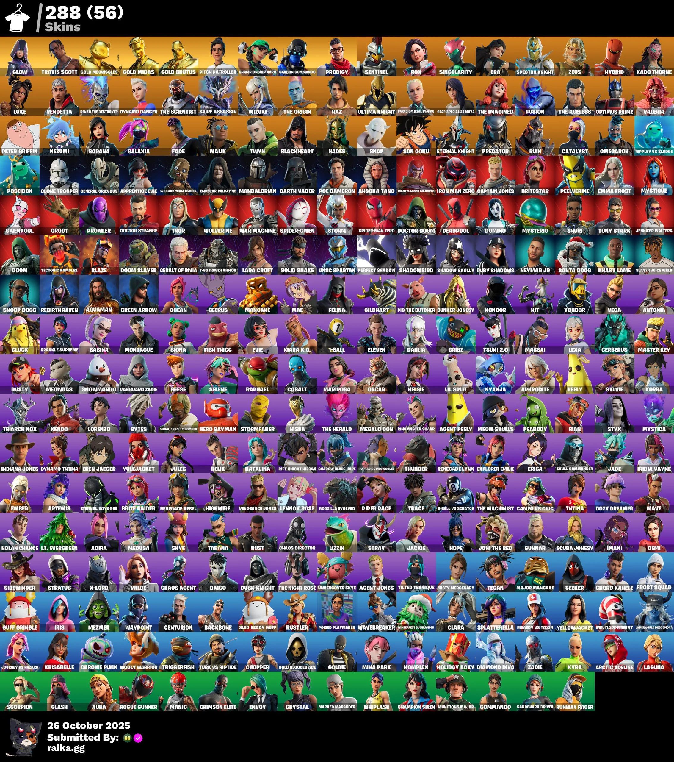 [PC/PSN/XBOX] 288 skins | Glow | Travis Scott | Gold Meowscles | Gold Midas | Gold Brutus | Pitch Patroller | Championship Aura | Carbon Commando | Prodigy | 150 VB