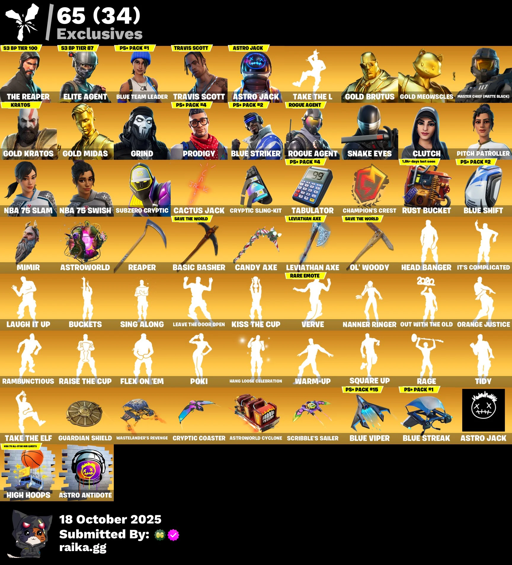 [PC/PSN/XBOX] 356 skins | The Reaper | Elite Agent | Leviathan Axe | Travis Scott | Astro Jack | Gold Brutus | Gold Meowscles | Master Chief (Matte Black) | 50 VB