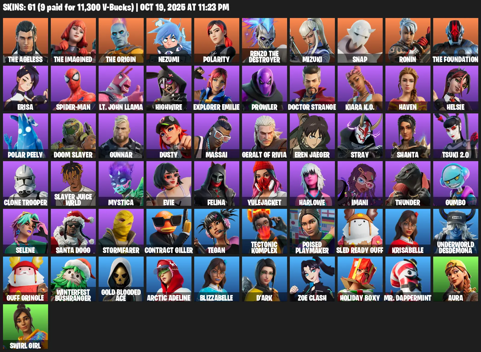 ๐จ [PC/PSN/XBOX] ๐ 61 skins | The Ageless , The Imagined , The Origin , Renzo The Destroyer , Mizuki , Doctor Strange , Geralt of Rivia , Eren Jaeger , Slayer Juice WRLD | ๐ 300 VBUCKS | โ๏ธ Changeable Email Now