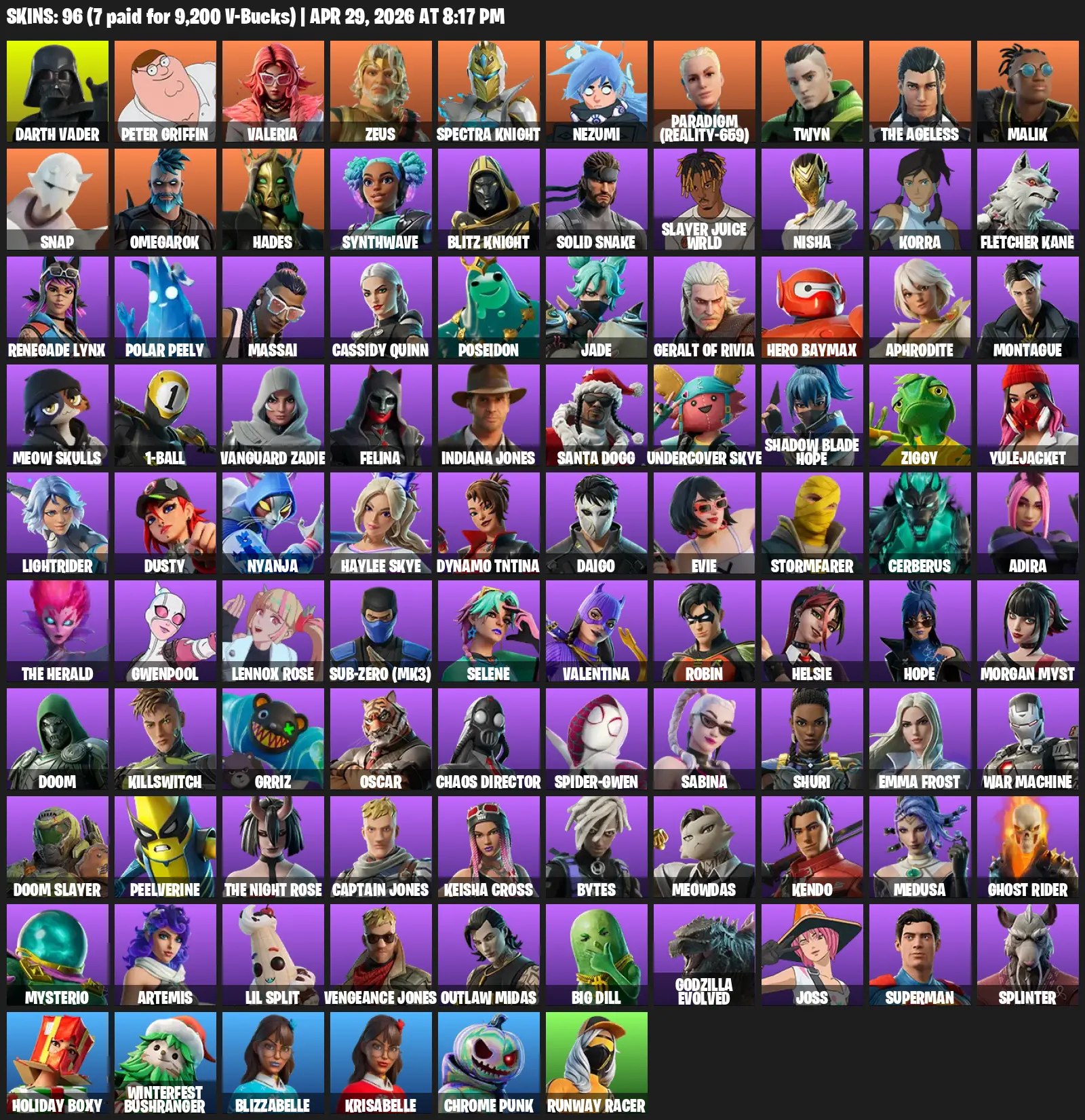 [PC/PSN/XBOX] | 96 skins | 1300 V-bucks | Darth Vader | Peter Griffin | Valeria | Zeus | Spectra Knight | Nezumi | Paradigm (Reality-659) | #SEZ3584