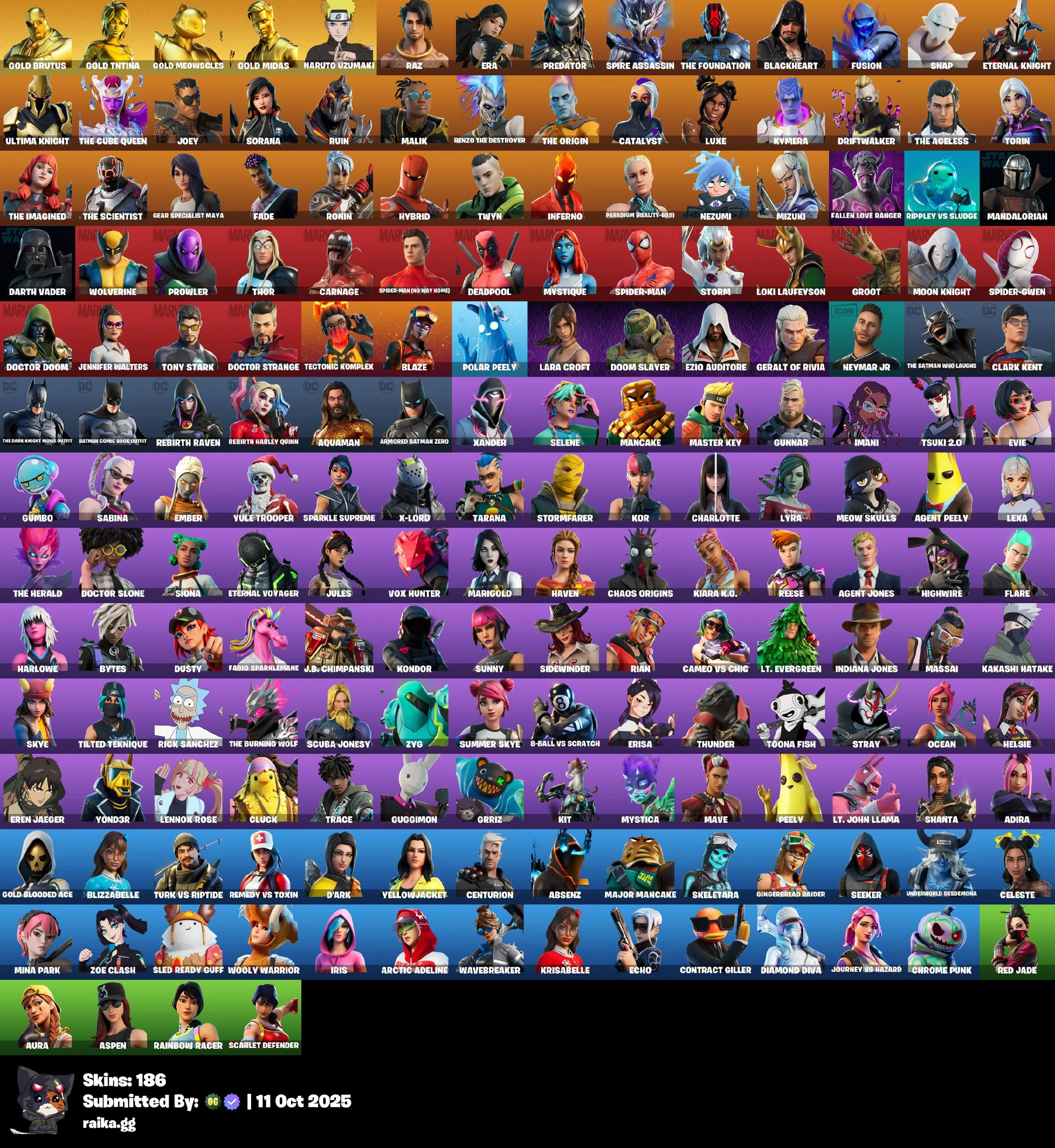 [PC/PSN/XBOX] ( Parental ) 186 skins | Reaper | Gold Brutus | Gold TNTina | Gold Meowscles | Gold Midas | Naruto Uzumaki | Raz | Era | Predator | Spire Assassin | The Foundation | 600 VB