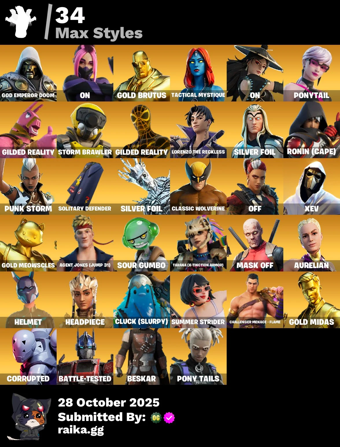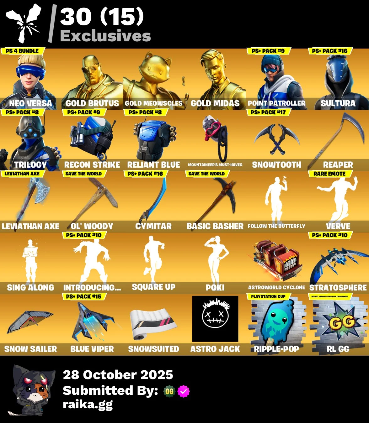 PC/PSN/Xbox/Nintendo 102 skins | Leviathan Axe | Neo Versa | Gold Brutus | Gold Meowscles | Gold Midas | Point Patroller | Sultura | Trilogy | Malik | Paradigm (Reality-659) | Era | 150 VB